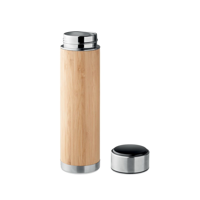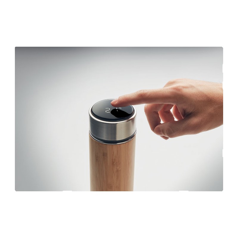 Bouteille à vide isolante à double paroi en acier inoxydable/bambou avec infuseur de thé à l'intérieur. Thermomètre tactile LED dans le couvercle. 1 pile CR2032 incluse. Contenance : 480 ml. Sans fuite. Le bambou est un produit naturel, et présente de légères variations de couleur, de décoration et de tailles.