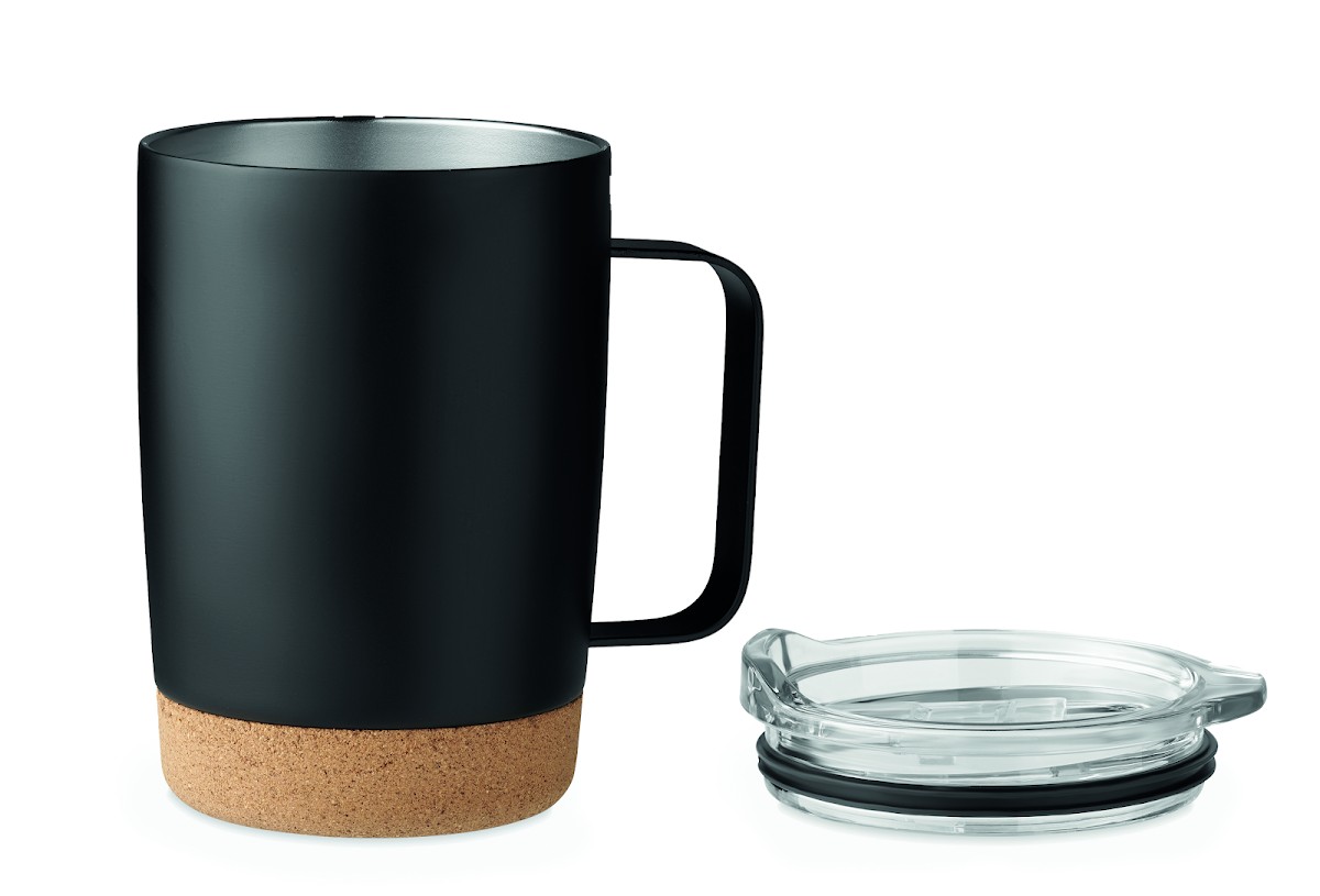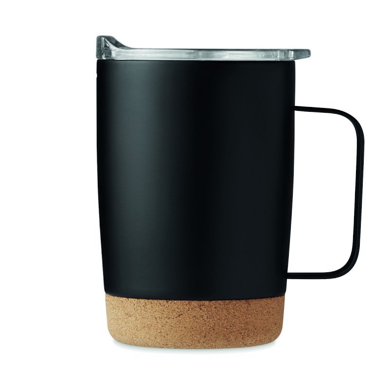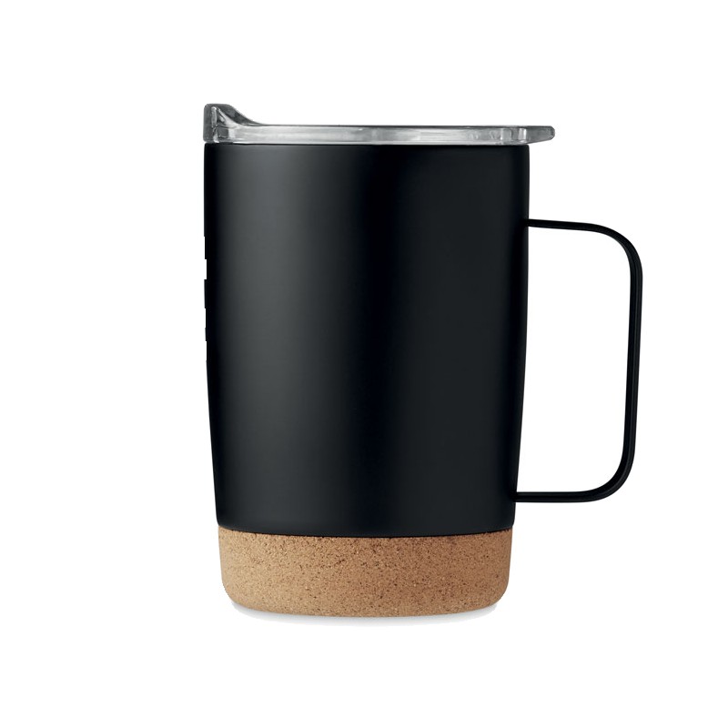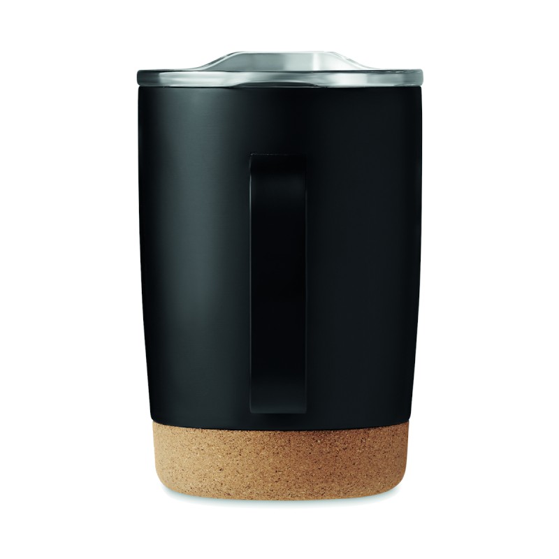 Mug en acier inoxydable à double paroi avec base en liège et couvercle coulissant. Capacité : 300 ml. Le liège est un matériau 100% naturel. En raison de sa structure et de la porosité de sa surface, le résultat final de l'impression par article peut présenter des différences.