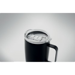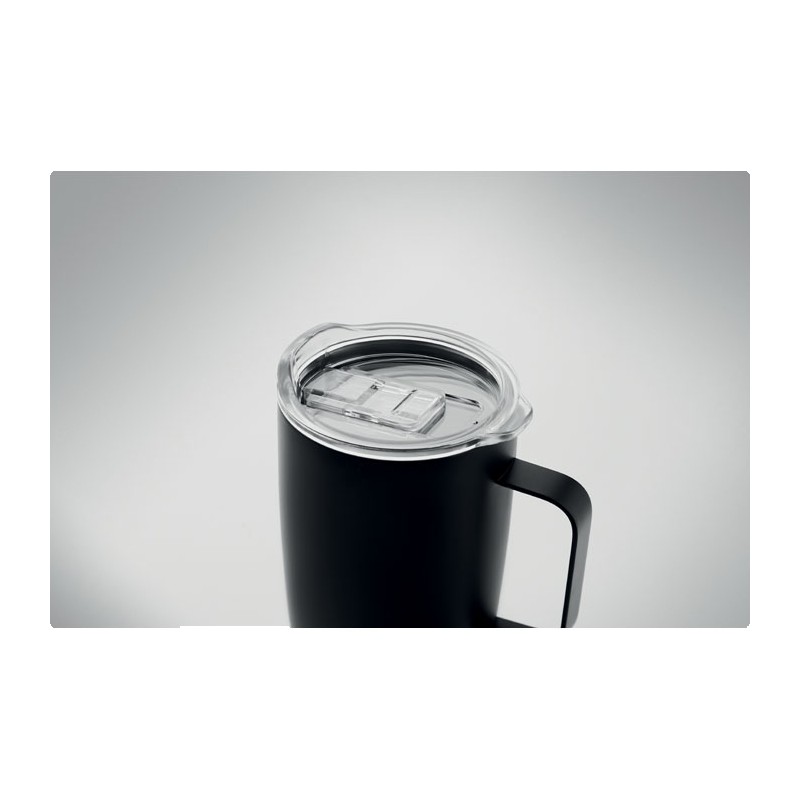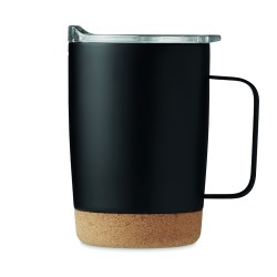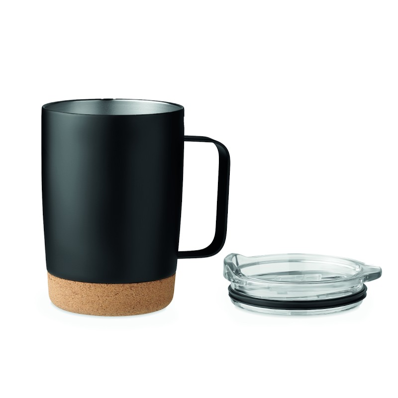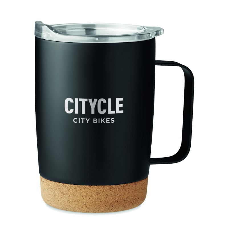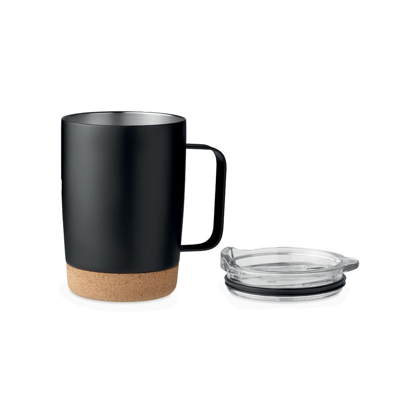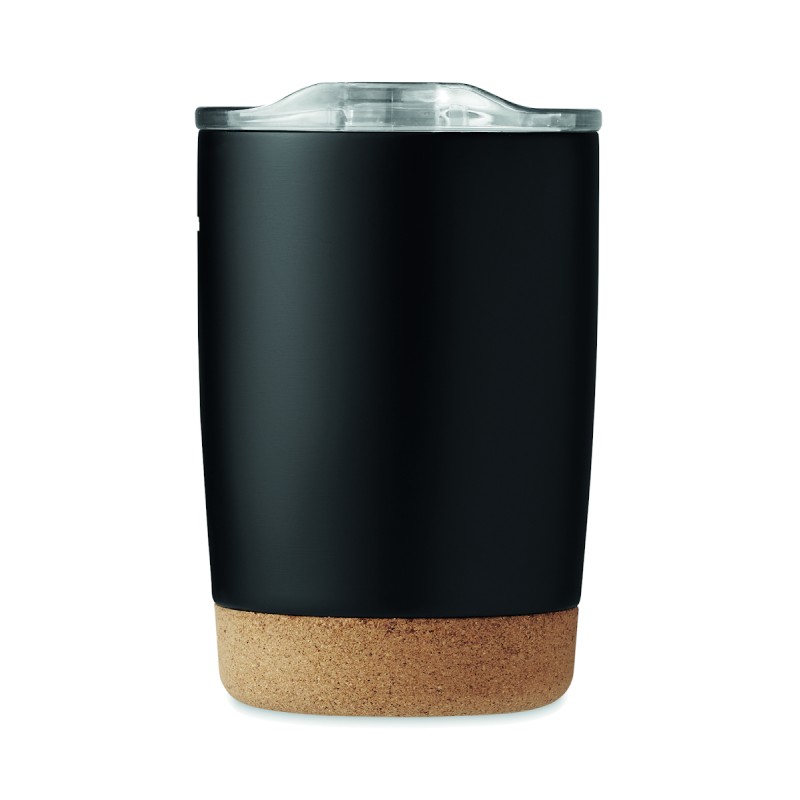 Mug en acier inoxydable à double paroi avec base en liège et couvercle coulissant. Capacité : 300 ml. Le liège est un matériau 100% naturel. En raison de sa structure et de la porosité de sa surface, le résultat final de l'impression par article peut présenter des différences.