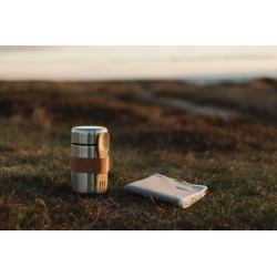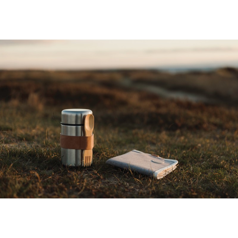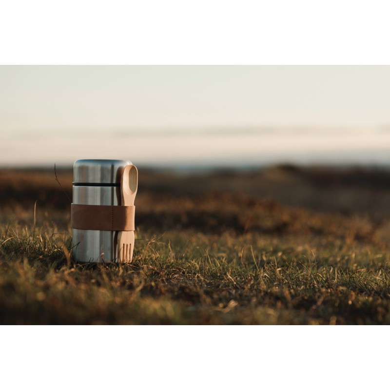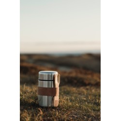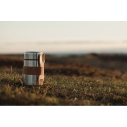 Thermos alimentaires de haute qualité en acier 18/8. La cuillère en bois qui l'accompagne peut être rangée dans une sangle fixée sur le thermos. La grande ouverture permet de remplir, de nettoyer et de manger directement dans le thermos.