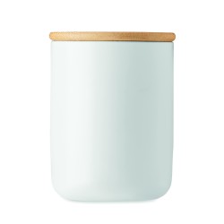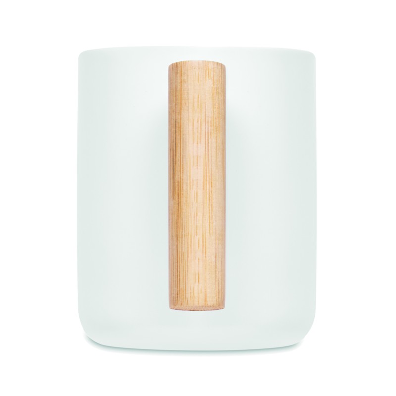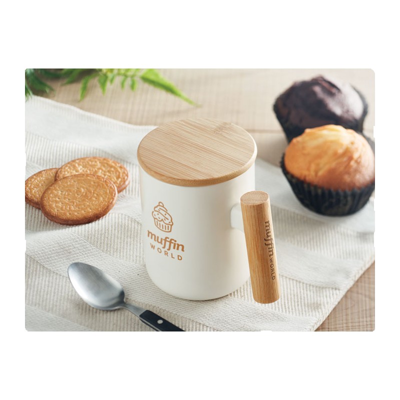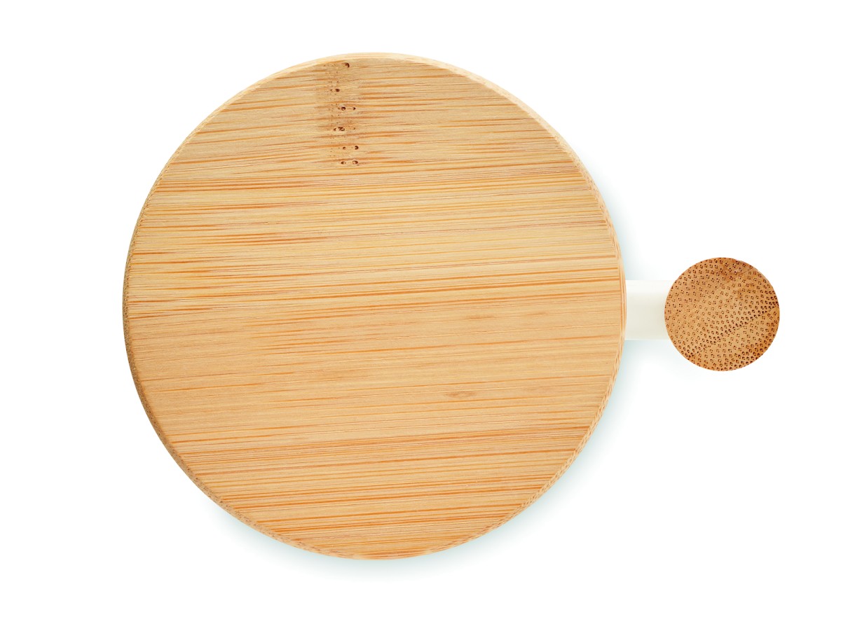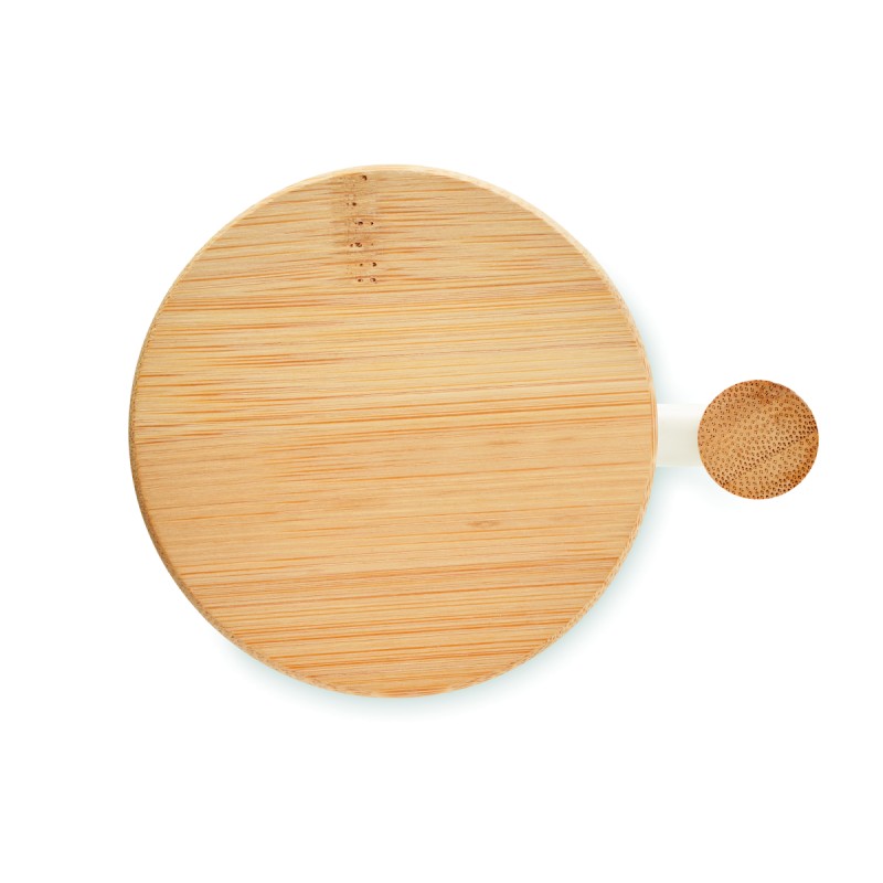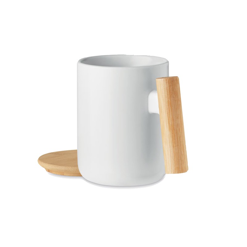 Mug en porcelaine avec couvercle et poignée en bambou. Capacité : 380 ml. Le bambou est un produit naturel, et présente de légères variations de couleur, de décoration et de tailles.