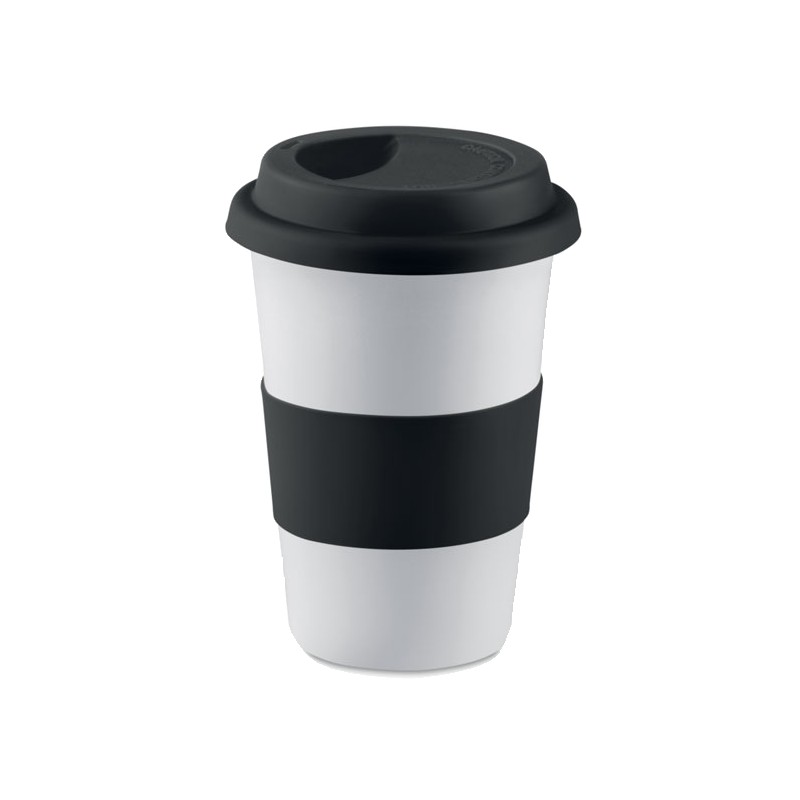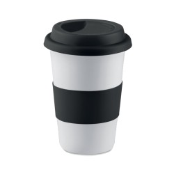 Mug simple paroi en céramique avec couvercle et bande en silicone. Capacité 400ml. La simple paroi n’exclut pas le transfert de chaleur.