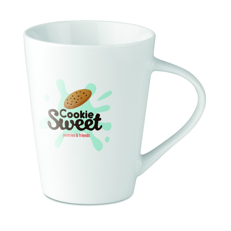 Mug en Porcelaine conique. Contenance: 250 ml. Emballage en vrac. La tampographie ne résiste pas au lave vaisselle. Le transfert céramique est résistant au lavage.