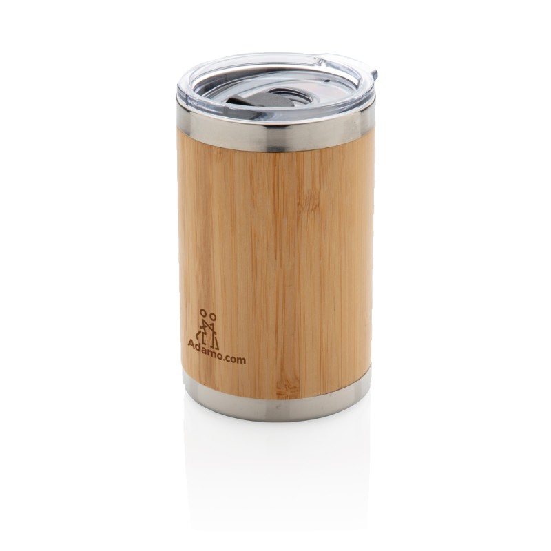 Mug 270ml extérieur en bambou et intérieur en acier inoydable 304. Taille compacte et idéale pour être placé sous la plupart des machines à café. Garde les boissons chaudes jusqu'à 3h et froides jusqu'à 6h.