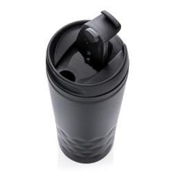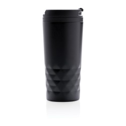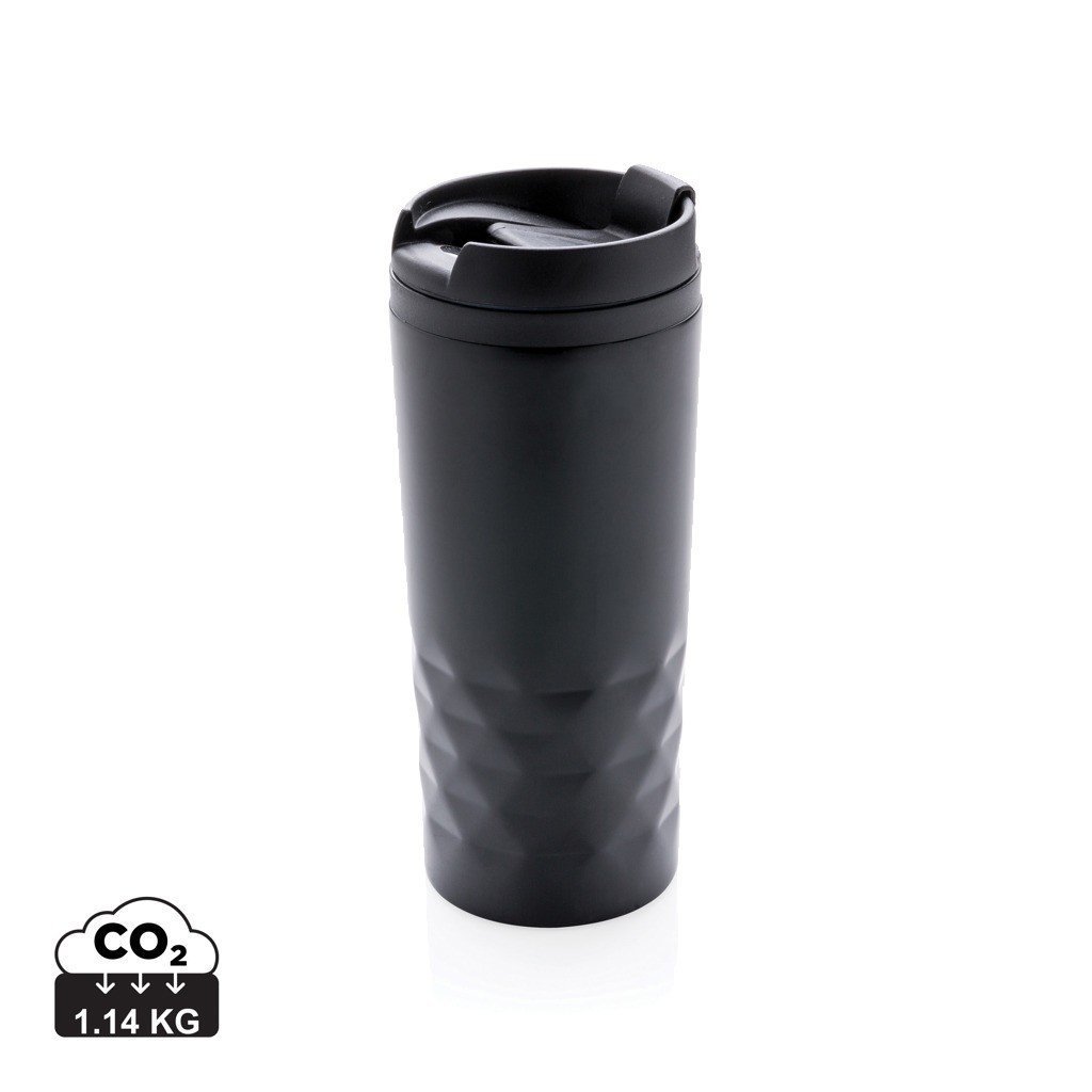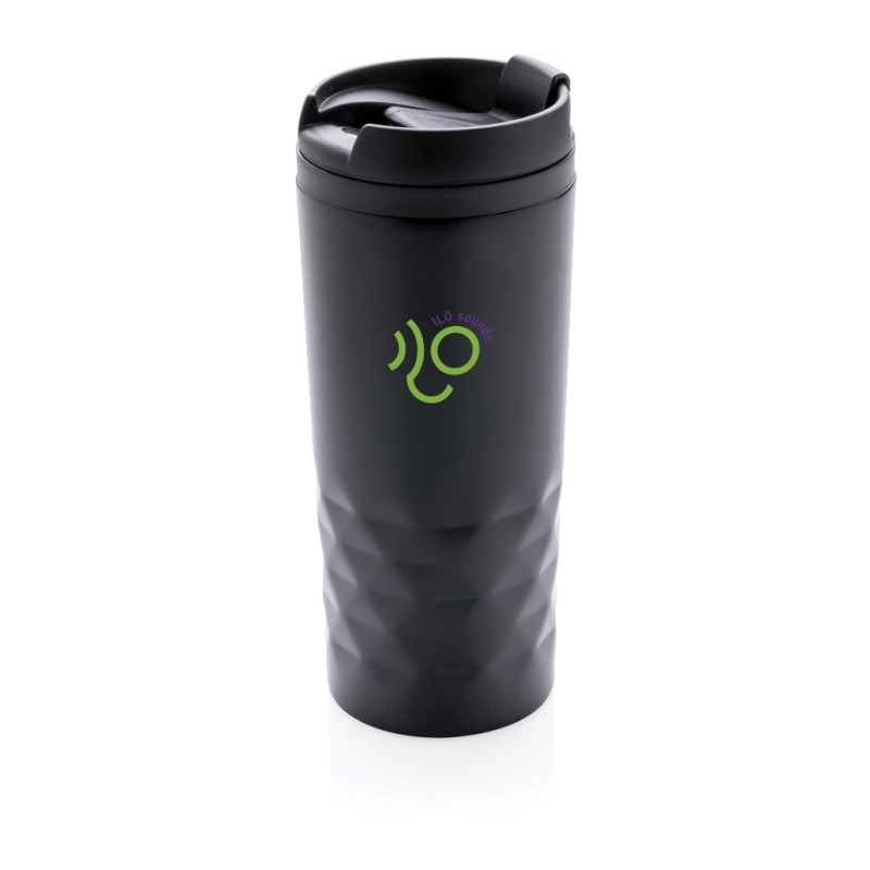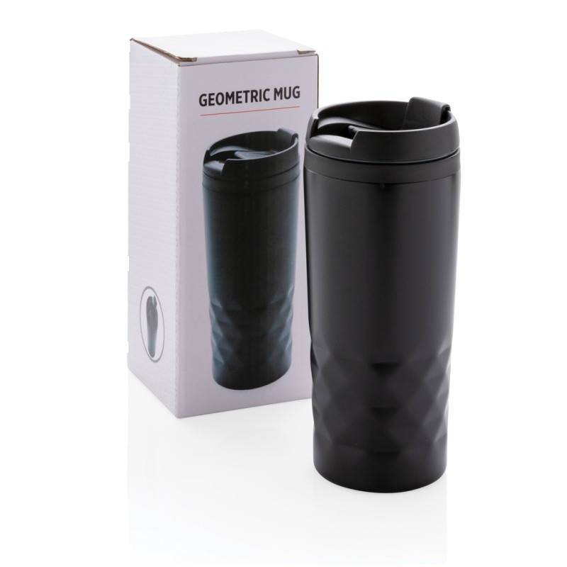 Mug 300ml avec détails géométriques, intérieur en plastique et extérieur en acier inoxydable.
