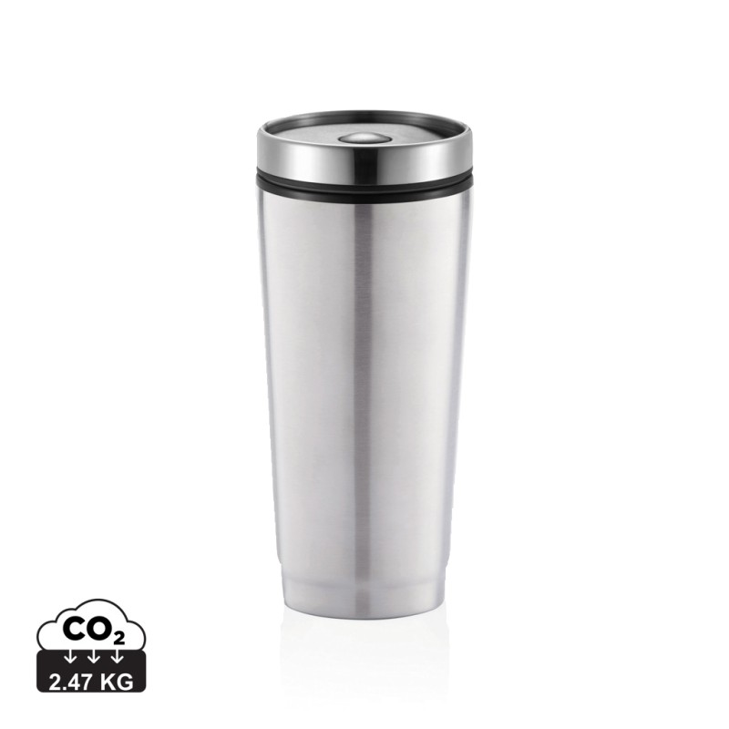 Mug 350ml, extérieur en acier inoxydable 201, intérieur en PP, couvercle vissé avec fermeture unique à bouton poussoir pour éviter les fuites. Peut être utilisé avec une seule main. Garde les boissons chaudes jusqu'à 3h et froides jusqu'à 6h. Modèle déposé®