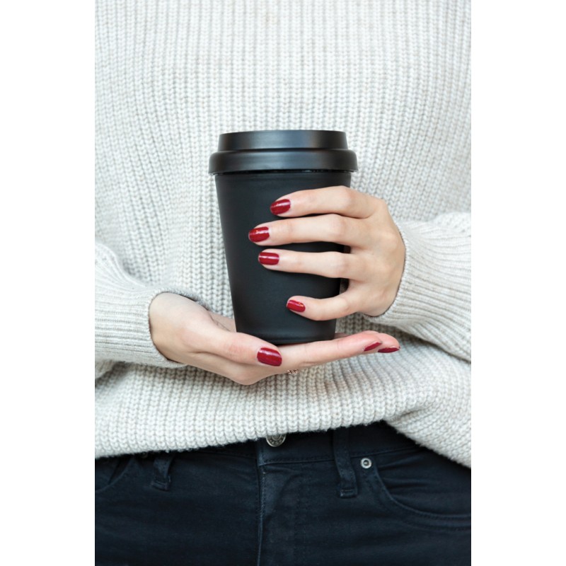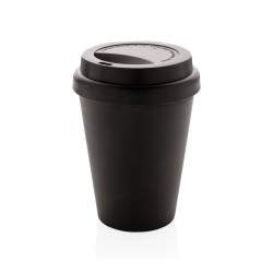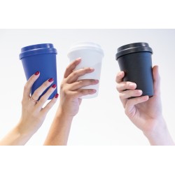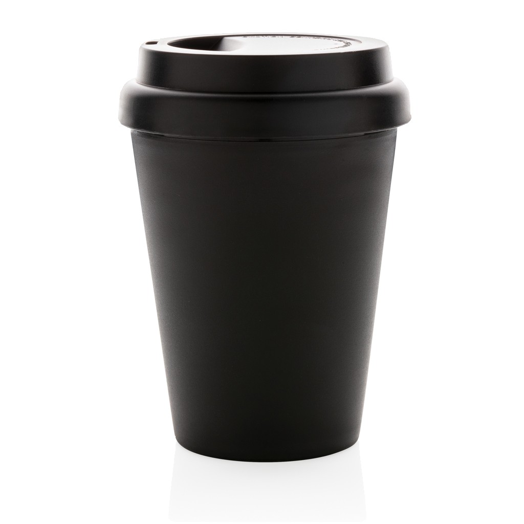 Mug 300ml à double paroi en PP recyclable et couvercle à vis. Convient pour les boissons froides et les boissons chaudes jusqu'à 100 degrés. Lavage à la main uniquement.