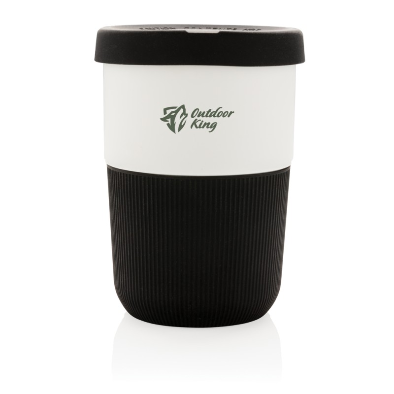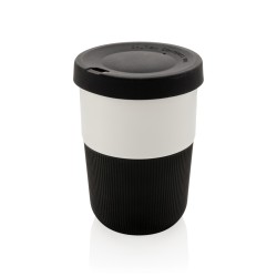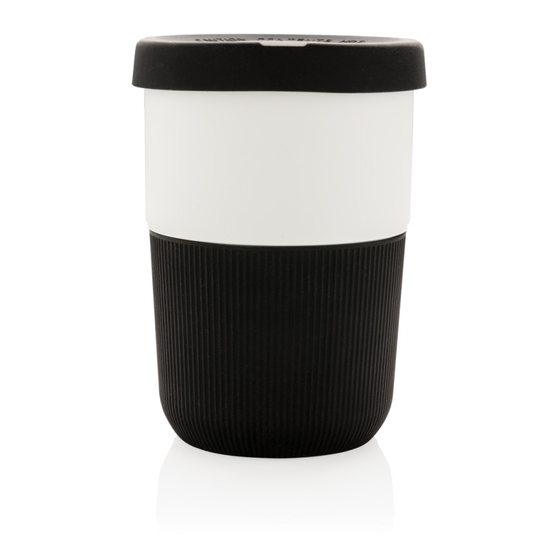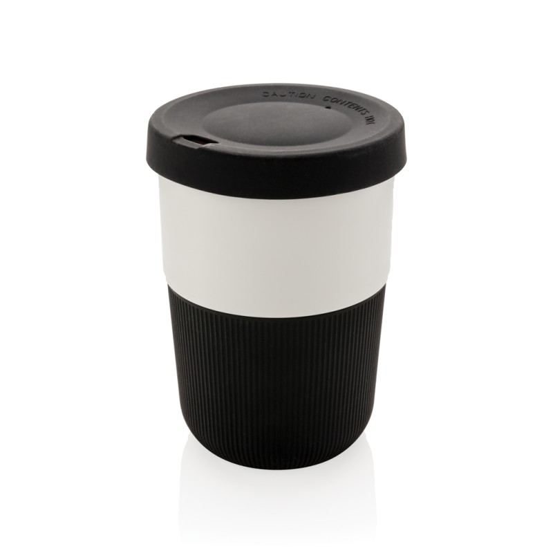 Mug 380ml avec partie blanche en PLA (100% de matériel végétal). Couvercle et bandeau de protection en silicone. 100% sans mélamine. Lavage à la main uniquement.