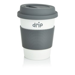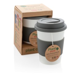 Mug 350 ml avec partie blanche en PLA. Couvercle et bandeau de protection en silicone. PLA : 100% matérieau végétal biodégradable.