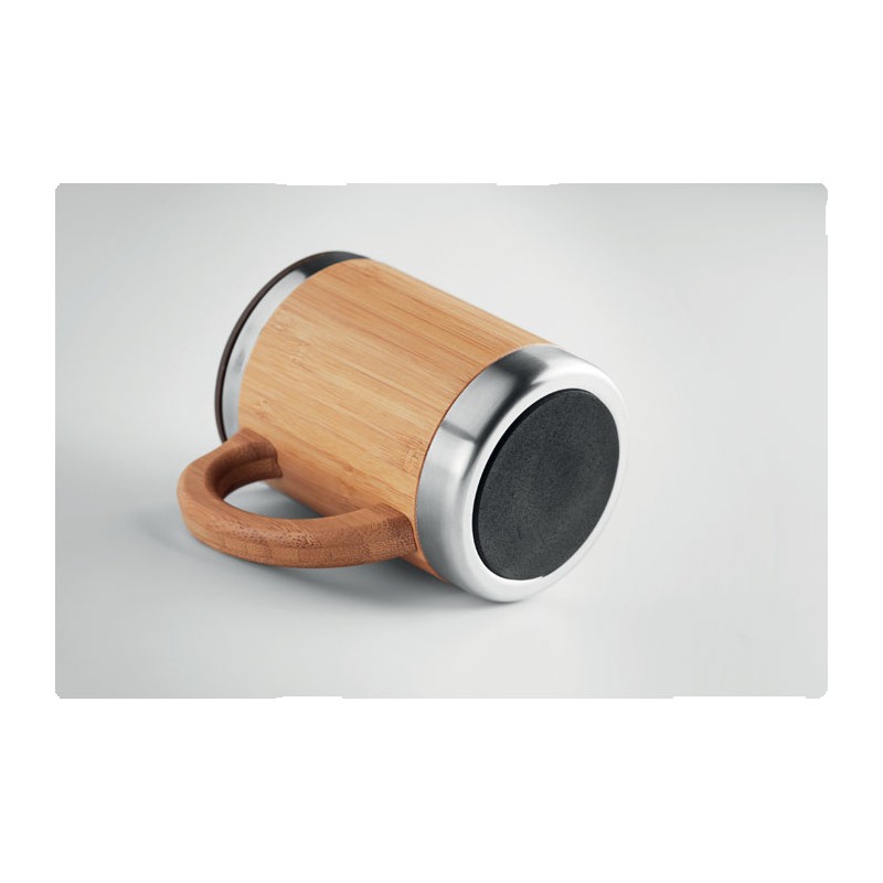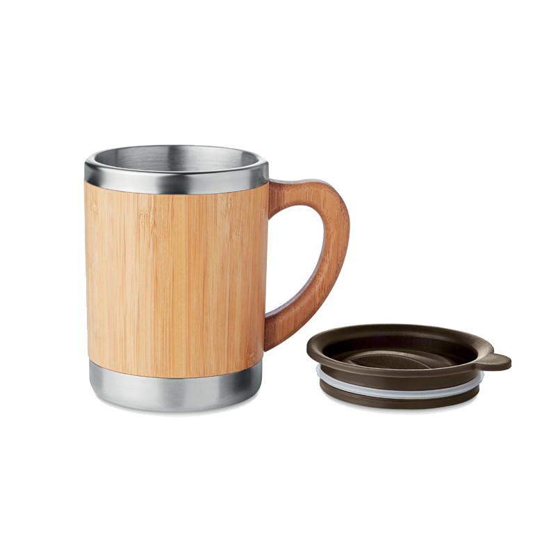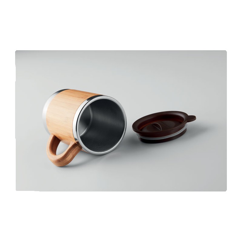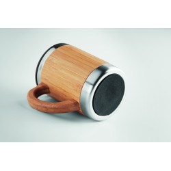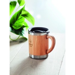 Gobelet en acier inoxydable à double paroi avec revêtement en bambou et ouverture rotative. Capacité 300 ml. Le bambou est un produit naturel, et présente de légères variations de couleur, de décoration et de tailles.