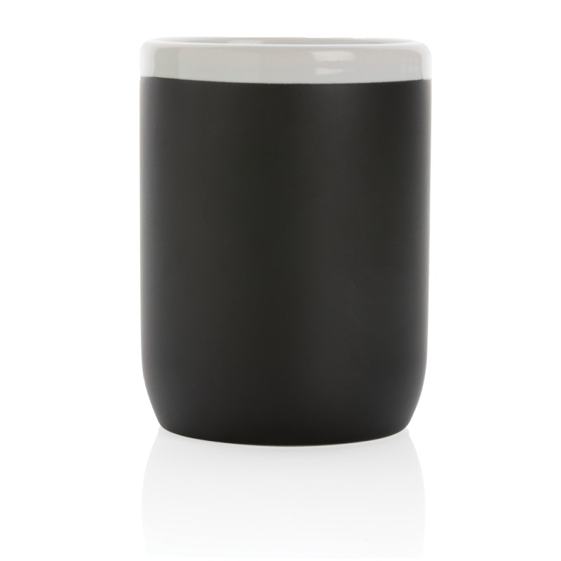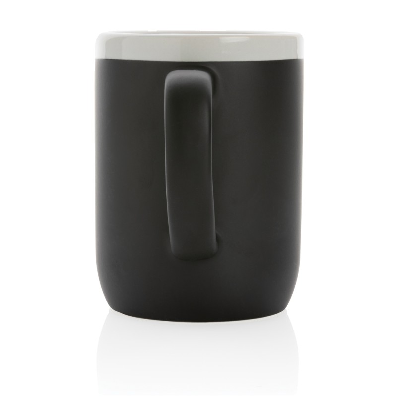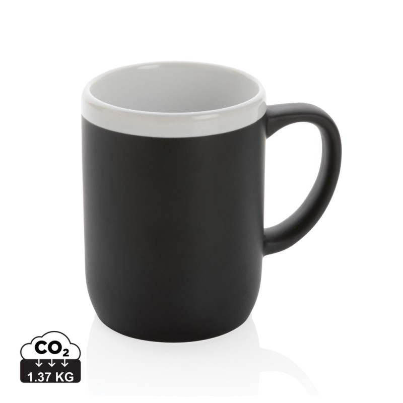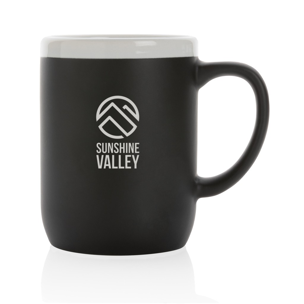 Mug 300ml en céramique avec rebord blanc. Finition intérieure brillante et une finition extérieure mate. Le mug peut être mis au lave-vaisselle et a été testé conformément à la norme EN12875-1 (au moins 125 cycles de lavage pour toutes les techniques de marquage). Emballé dans une boîte cadeau.