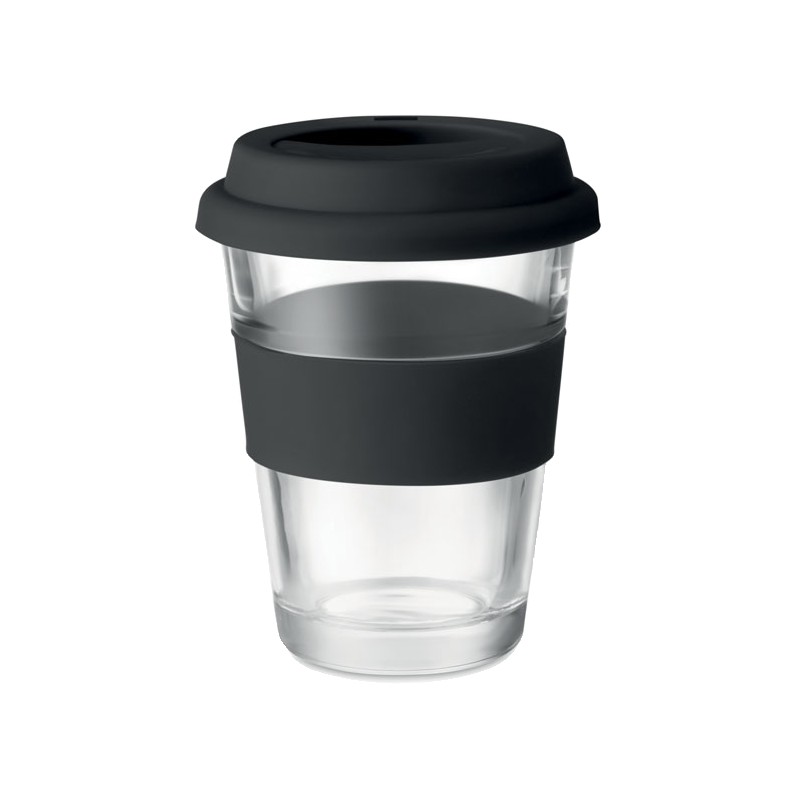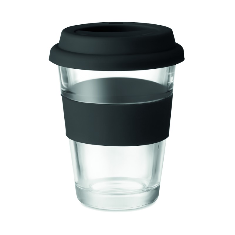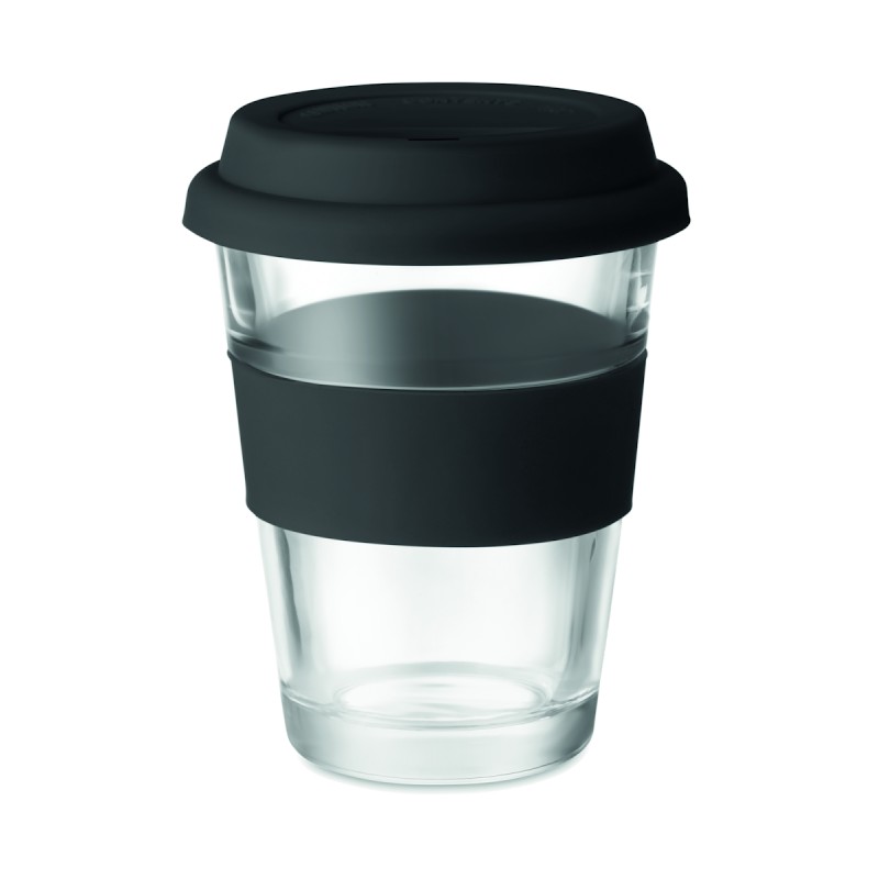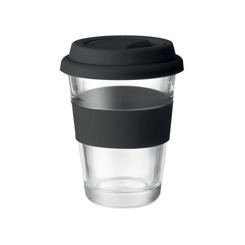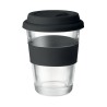 Gobelet en verre avec couvercle et poignée en silicone. Capacité 350 ml. Comme il s'agit d'une tasse à simple paroi, le transfert de chaleur peut encore se produire.