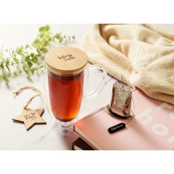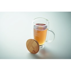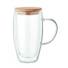 Mug en verre borosilicate double paroi avec poignée et couvercle en bambou. Capacité : 450 ml.