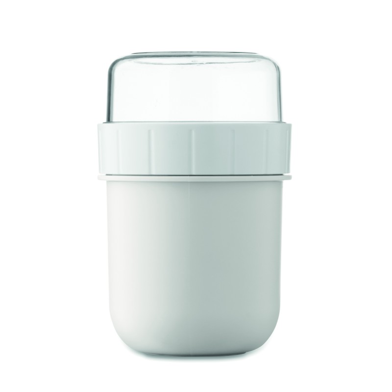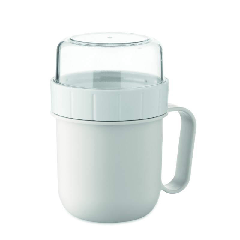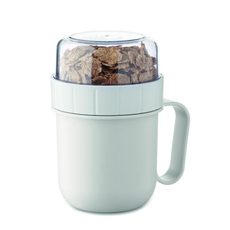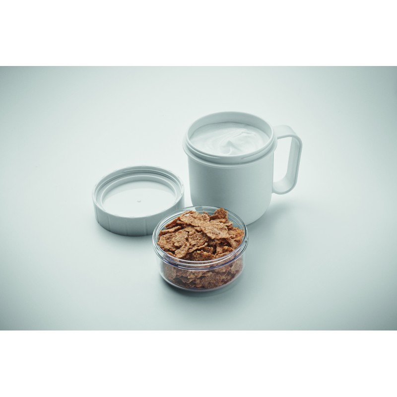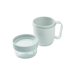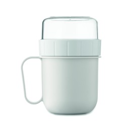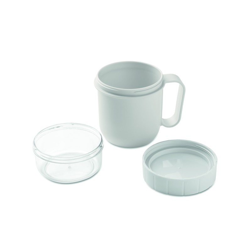 Mug et coupelle pour petit-déjeuner ou brunch à emporter en PP et couvercle en PS. Composé de 2 récipients individuels pour garder les ingrédients séparés. Capacité : 450 ml et 160 ml. Anti fuite.
