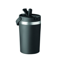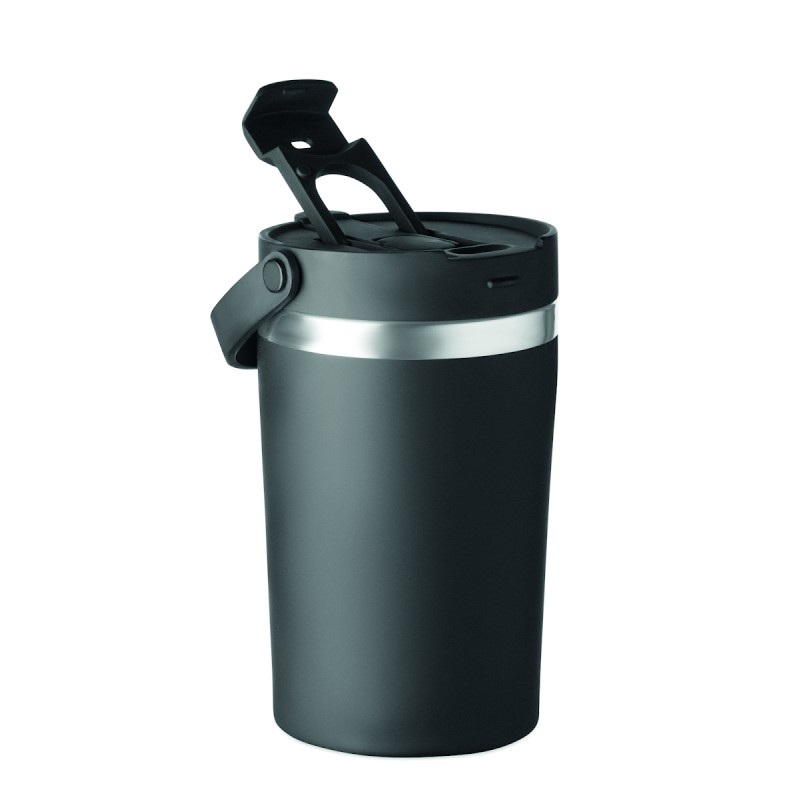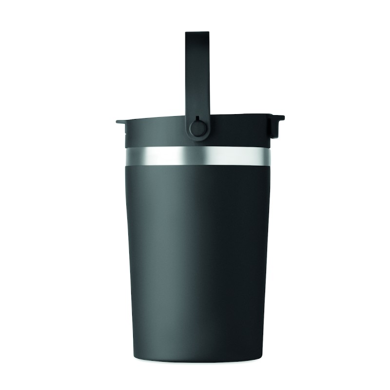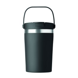 Gobelet à double paroi en acier inox recyclé (90 % d'acier inox recyclé et 10 % d'acier inox) avec couvercle 2-en-1 en PP et sangle de transport en RPET. Anti fuite et durable. Capacité : 350 ml.