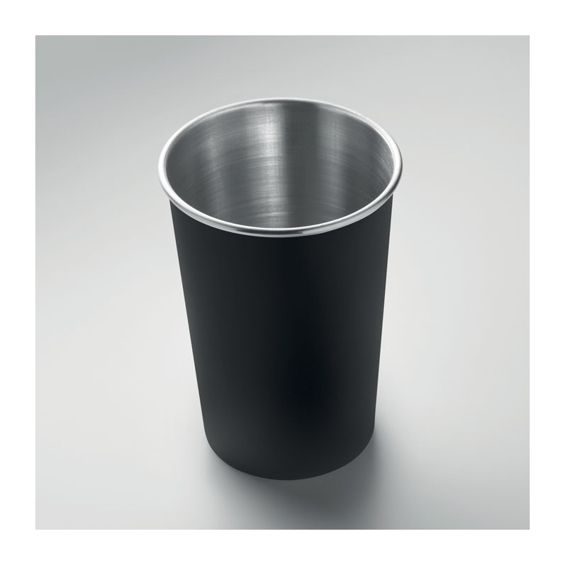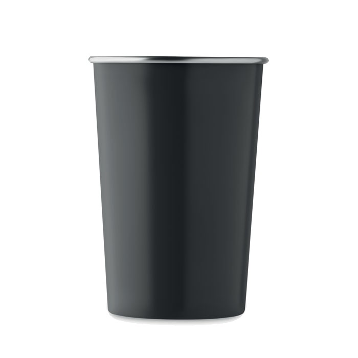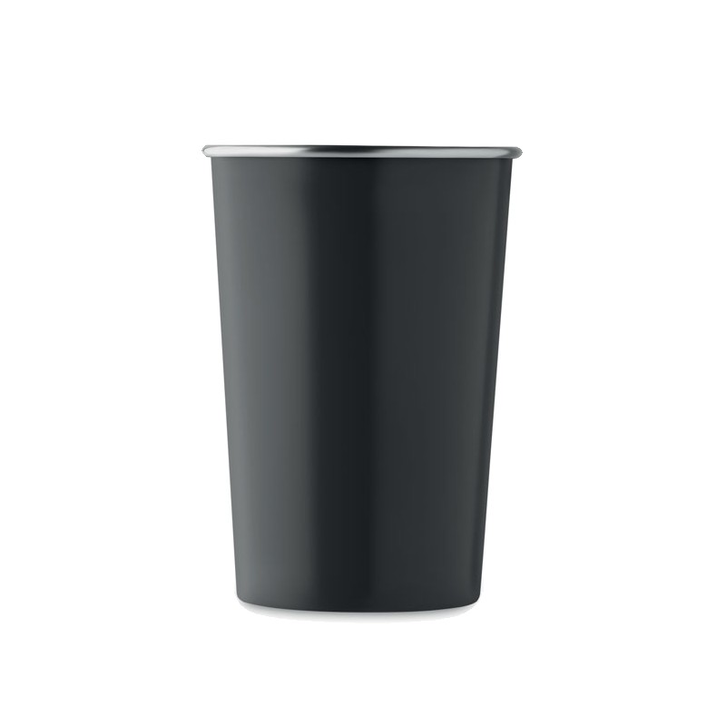 Gobelet réutilisable en acier inoxydable recyclé (90 % d'acier inoxydable recyclé et 10 % d'acier inoxydable). Capacité : 350 ml. La simple paroi n’empêche pas le transfert de chaleur.