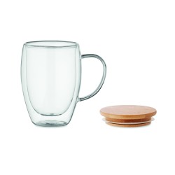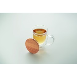 Mug en verre borosilicate double paroi avec anse et couvercle en bambou. Capacité : 350 ml.