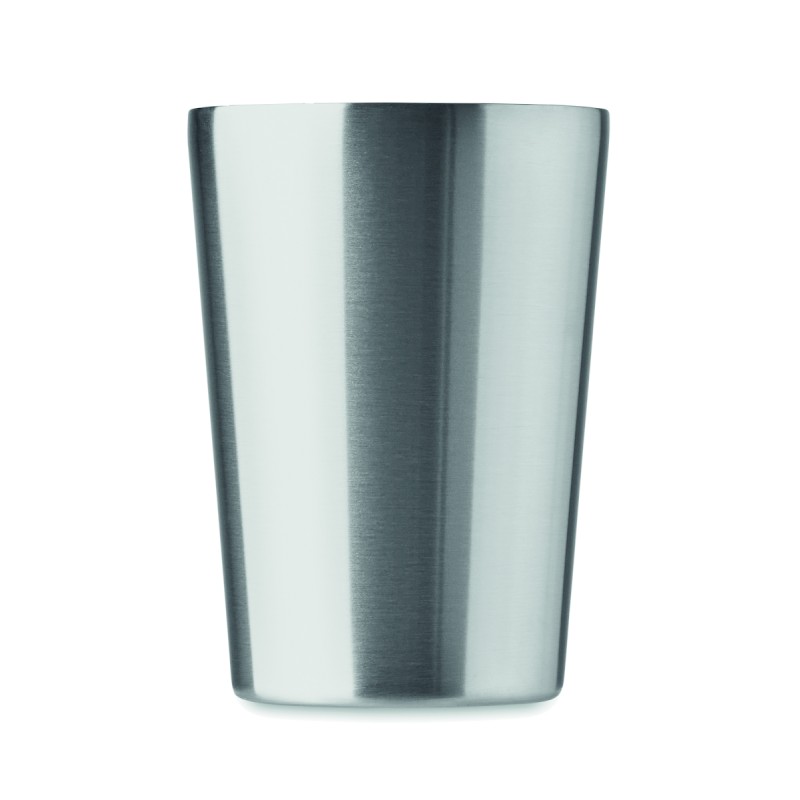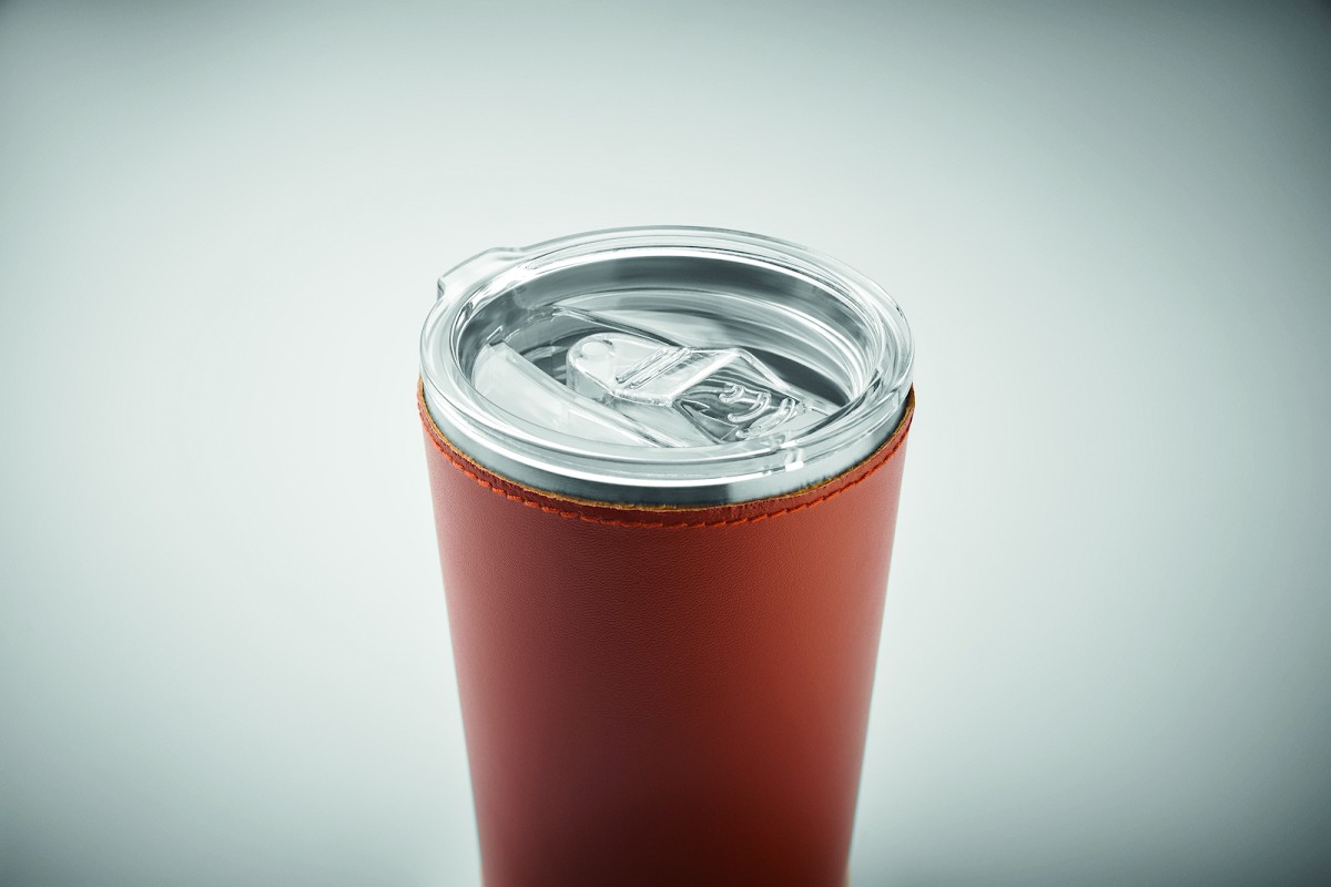Gobelet à double paroi en acier inoxydable recyclé (90 % d'acier inoxydable recyclé et 10 % d'acier inoxydable) avec manchon amovible en cuir PU. Couvercle avec ouverture coulissante. Anti fuite. Capacité : 350 ml.
