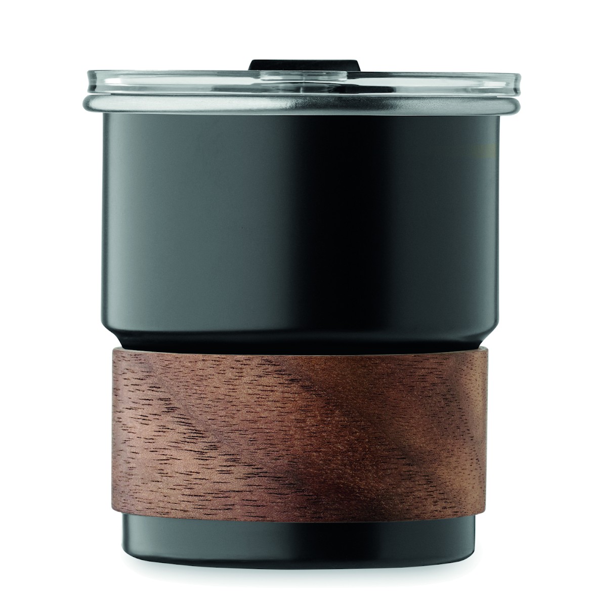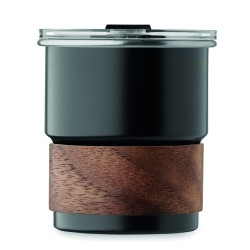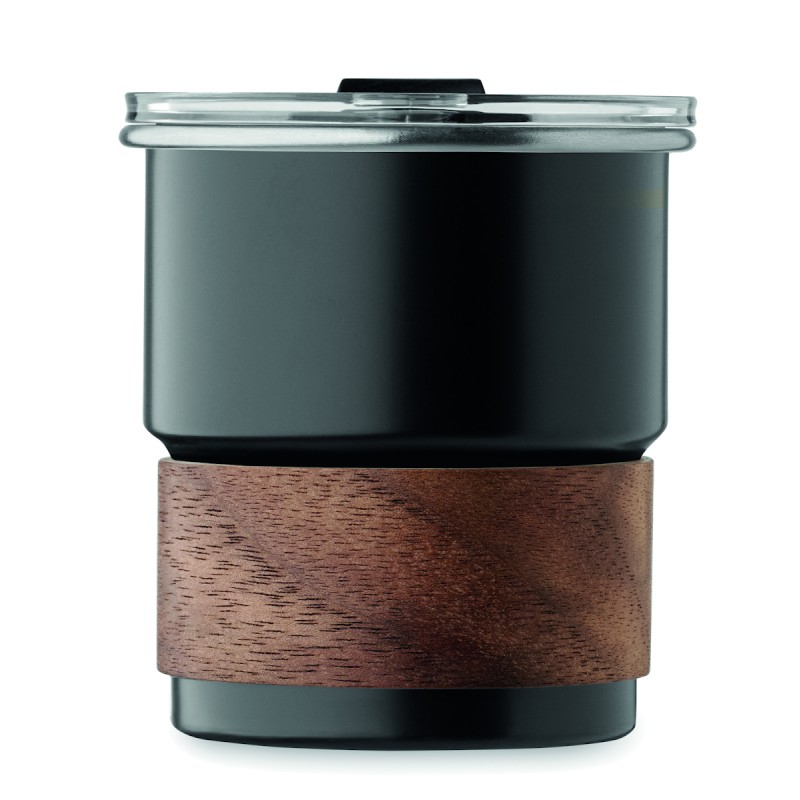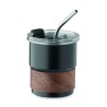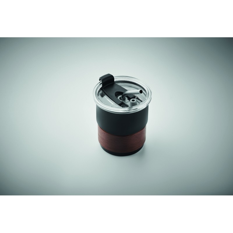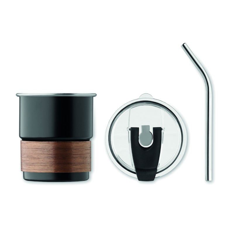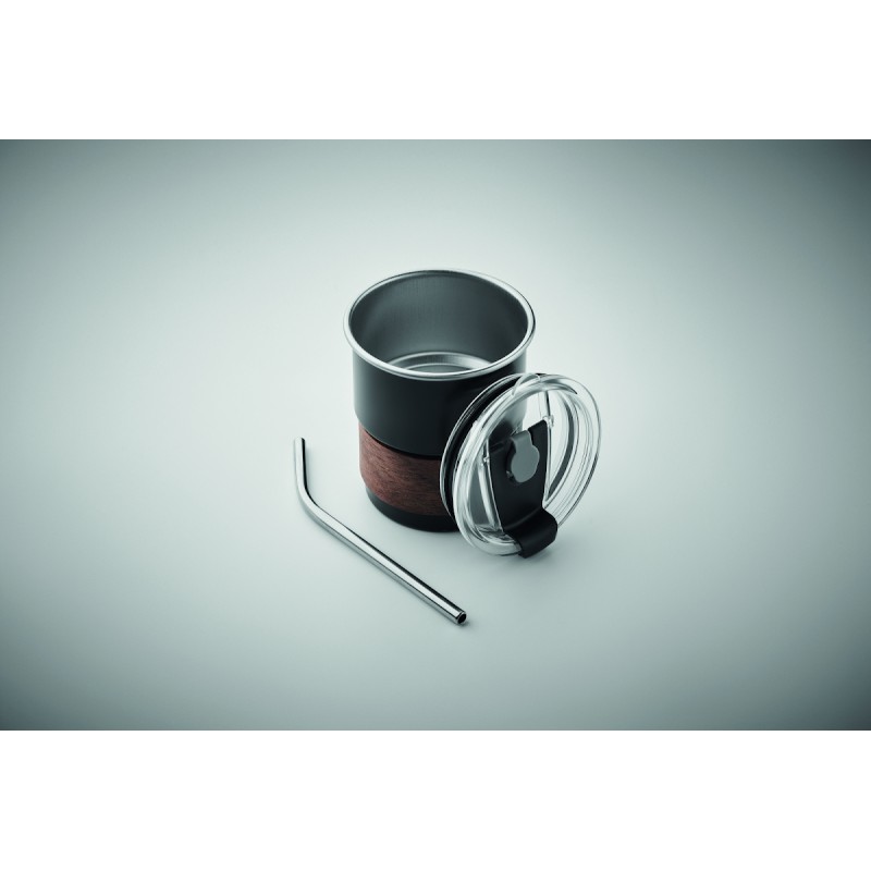 Gobelet simple paroi en acier inoxydable recyclé (90 % d'acier inoxydable recyclé et 10 % d'acier inoxydable) avec manchon amovible en bois d'acacia et paille en acier inoxydable. Couvercle anti-fuite à ouverture directe. Capacité : 260 ml.
