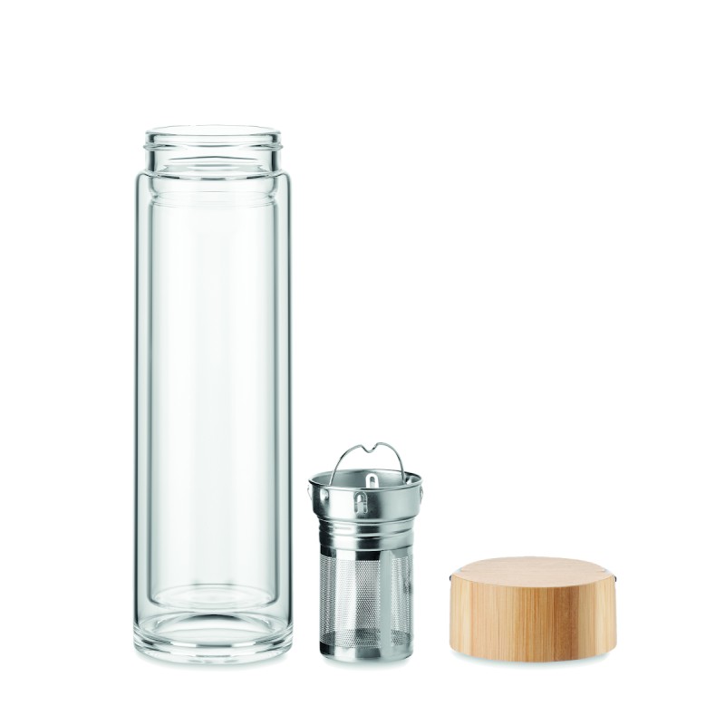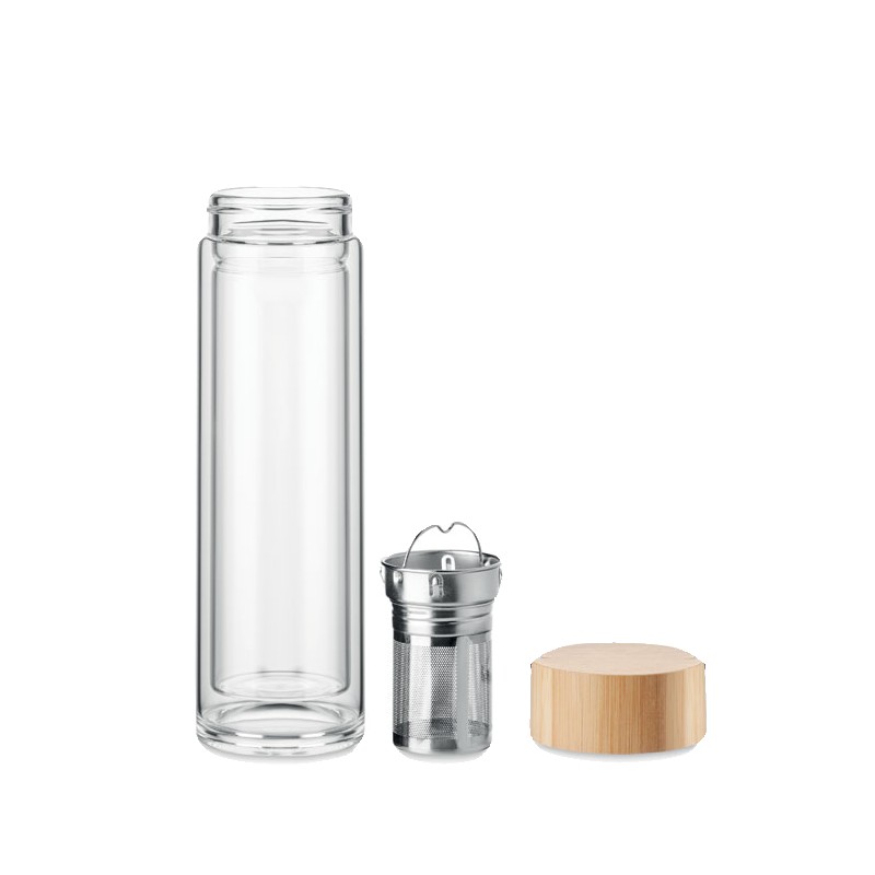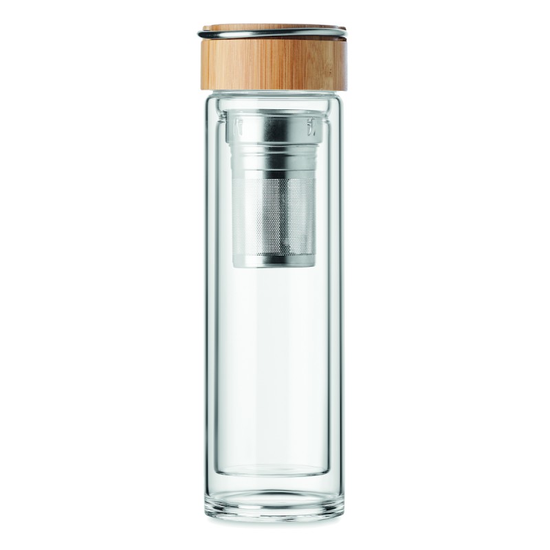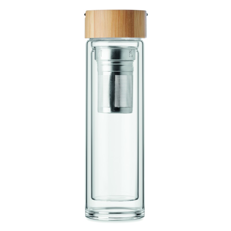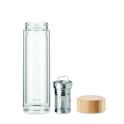 Bouteille double paroi en verre haut borosilicate et couvercle cintre en bambou avec infuseur à thé. Capacité : 400 ml. Le bambou est un produit naturel, et présente de légères variations de couleur, de décoration et de tailles.