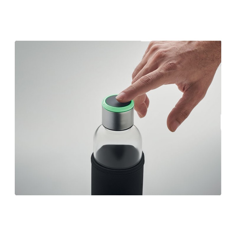 Bouteille en acier en verre borosilicate avec rappel d'hydratation dans une pochette. La lumière du capteur s'allume toutes les heures pour vous rappeler qu'il est temps de boire. Comprend 1 pile CR2032. Capacité : 500 ml.