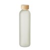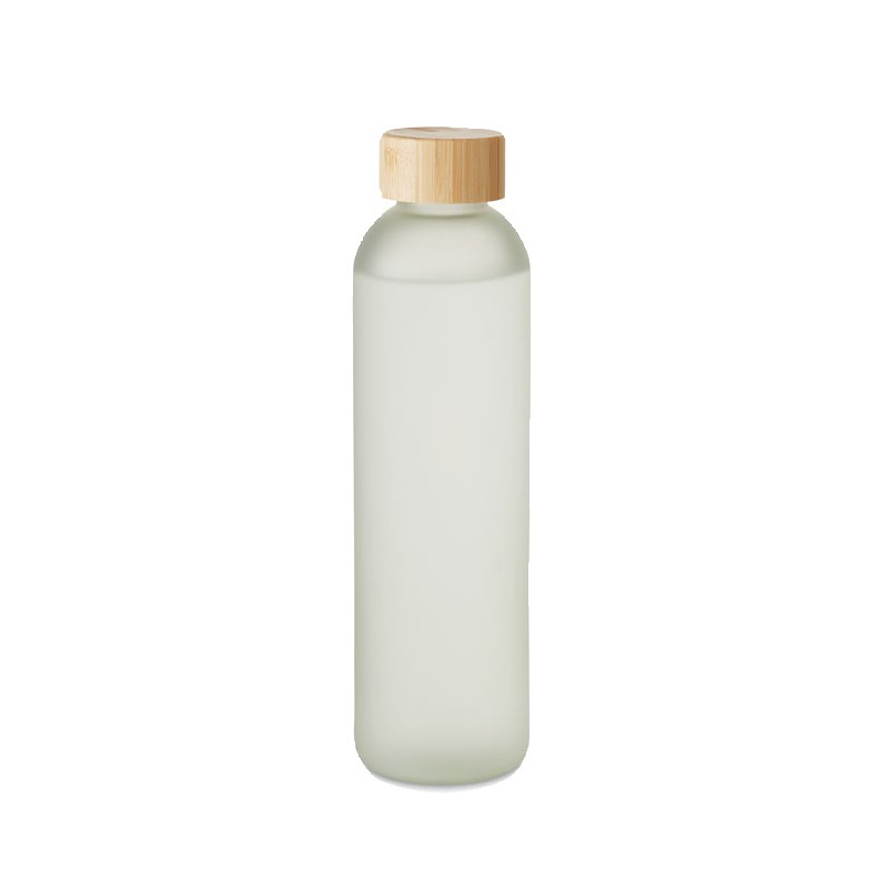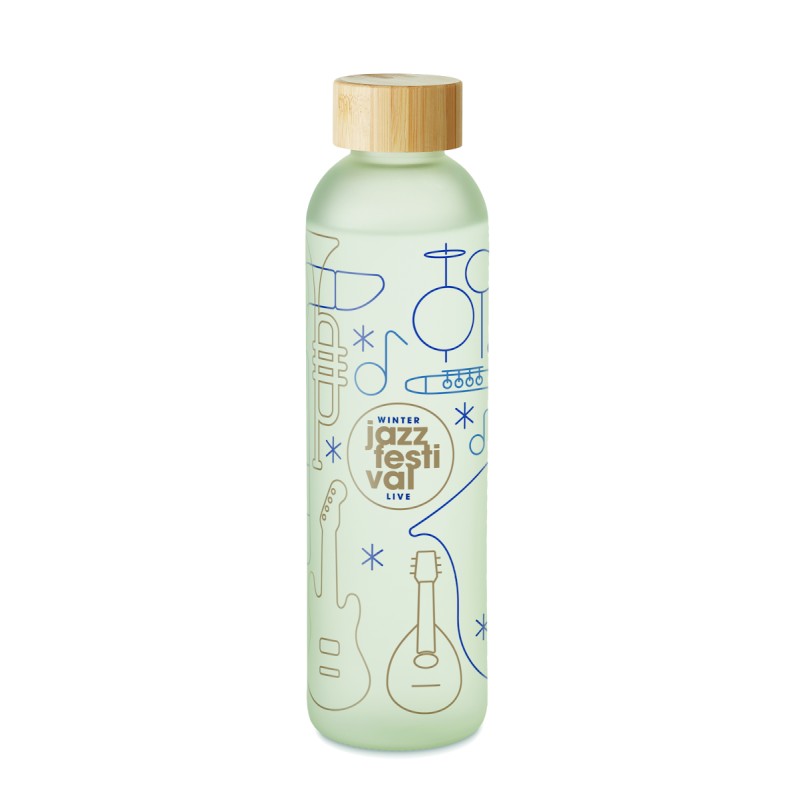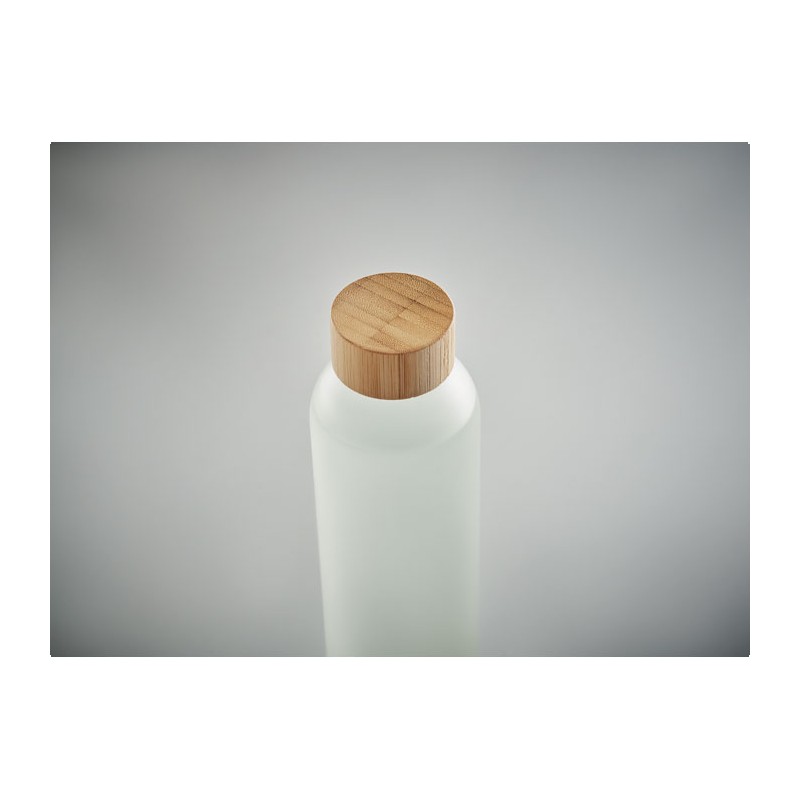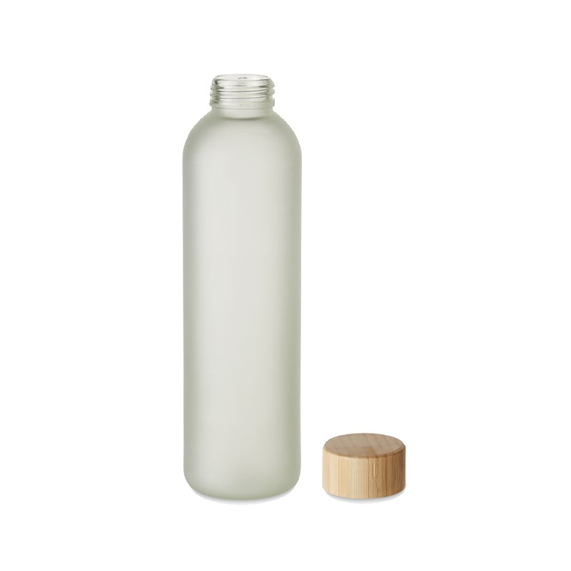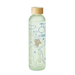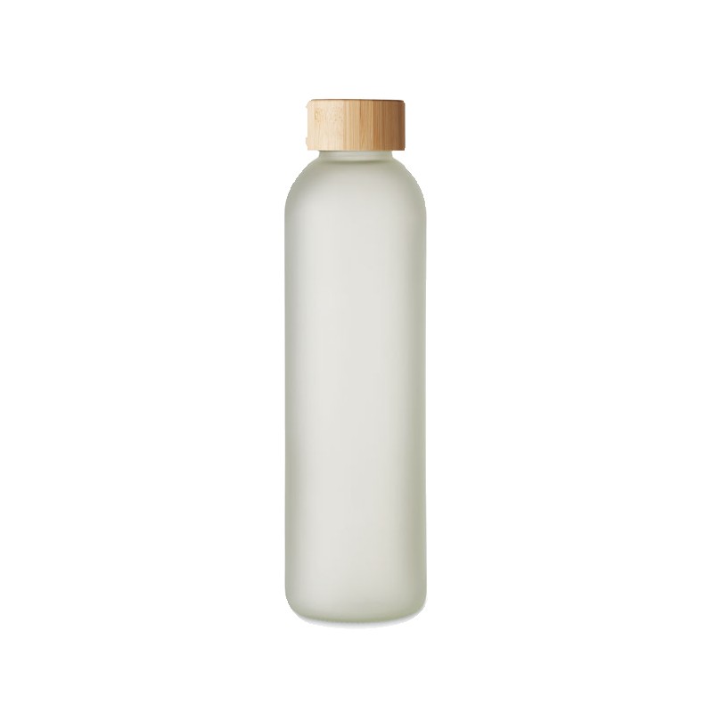 Bouteille en verre avec revêtement spécial pour la sublimation et couvercle en bambou. Capacité : 650 ml. Le bambou est un produit naturel, et présente de légères variations de couleur, de décoration et de tailles.