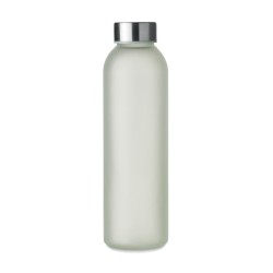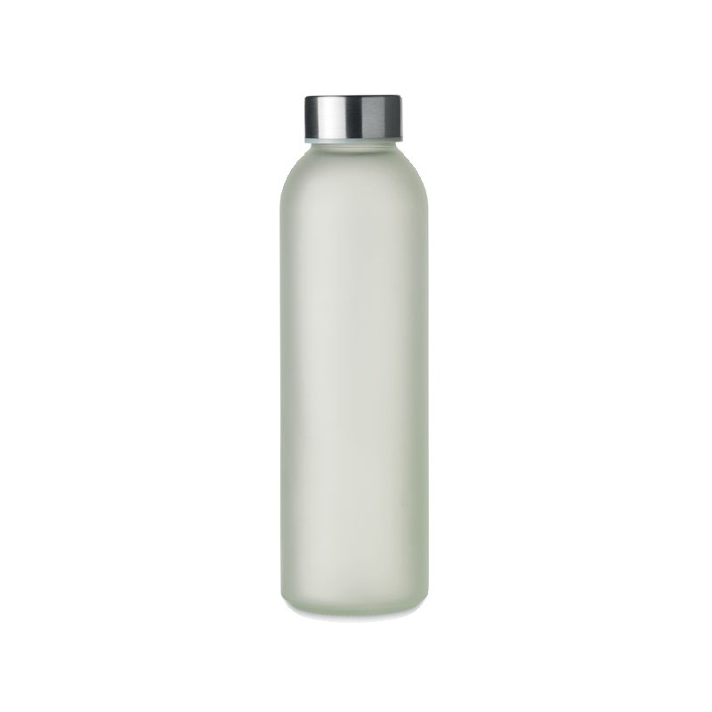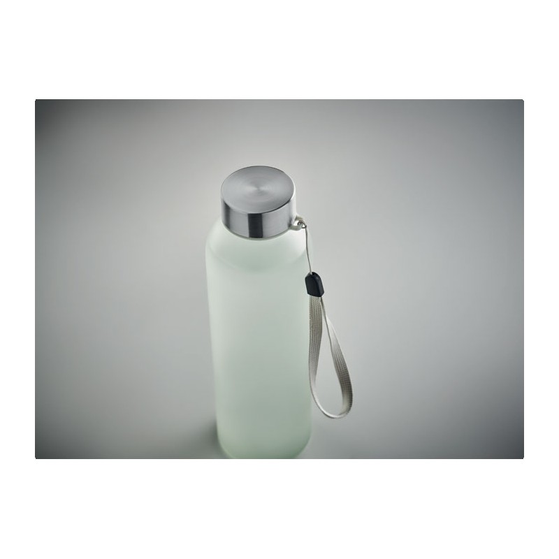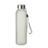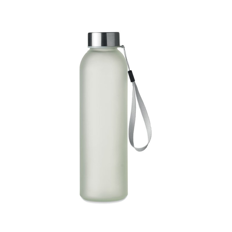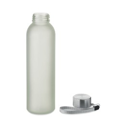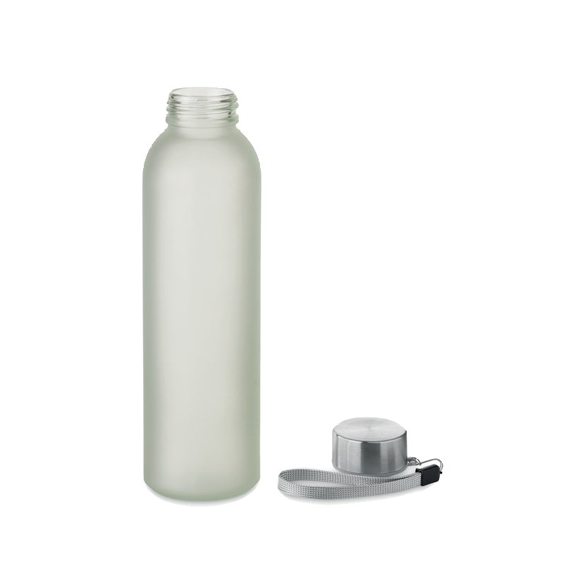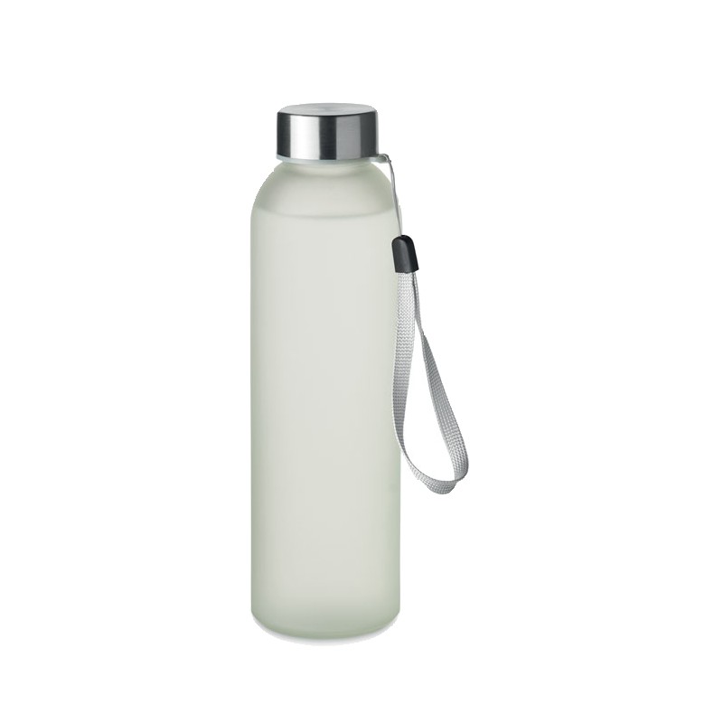 Bouteille en verre avec revêtement spécial pour la sublimation. Elle possède un couvercle en acier inoxydable et une sangle de suspension. Capacité : 500 ml.