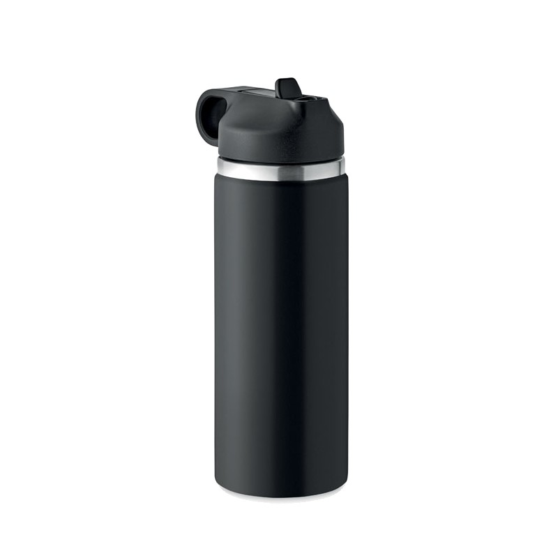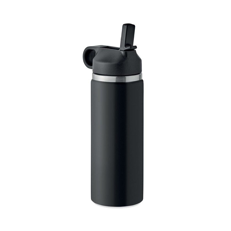 Bouteille à double paroi en acier inoxydable recyclé (90% d'acier inoxydable recyclé et 10% d'acier inoxydable recyclé) avec poignée, couvercle en PP et paille intégrée. Anti fuite. Capacité : 500 ml.