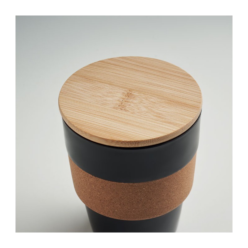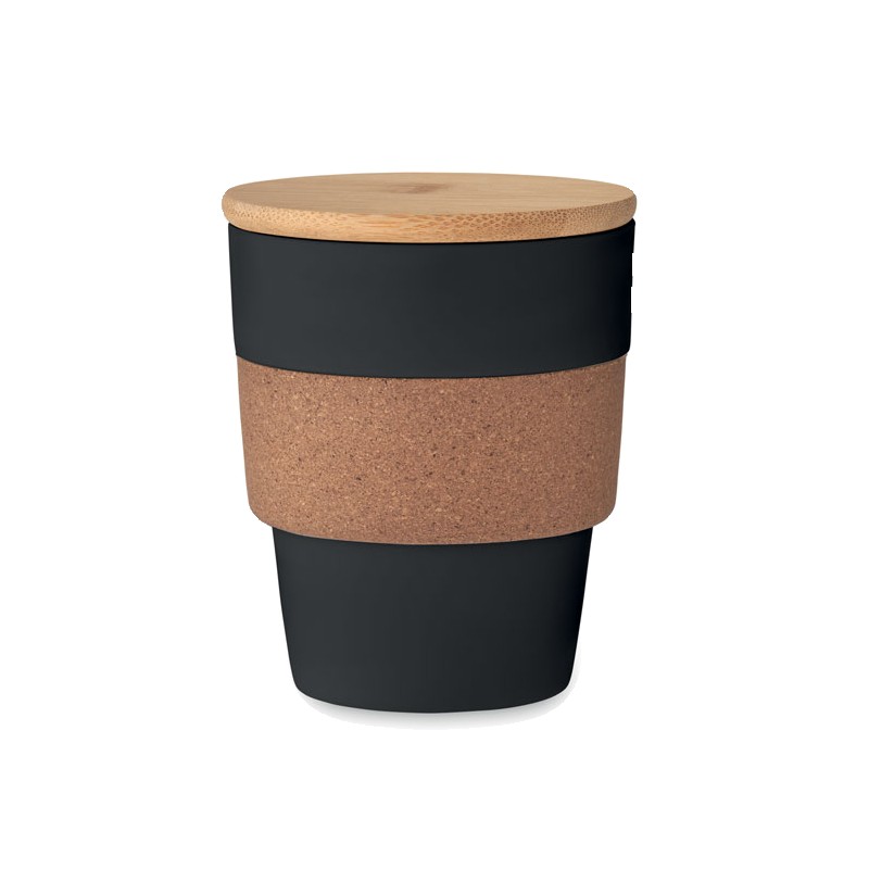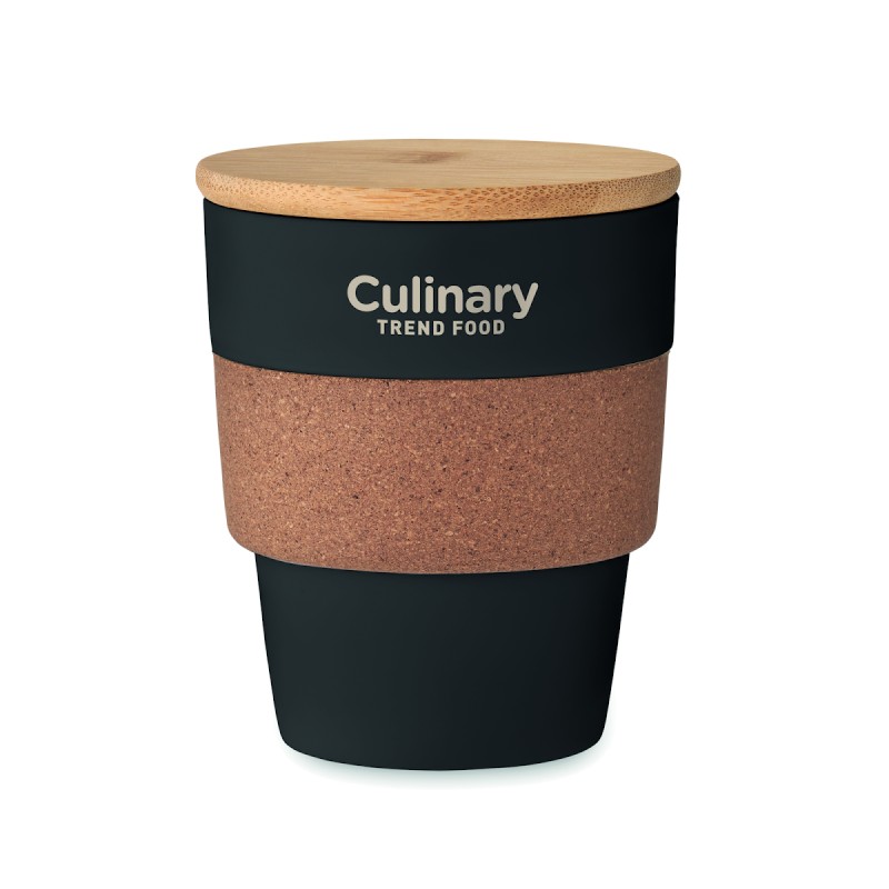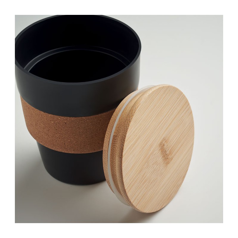 Gobelet simple paroi en PP avec bande de protection en liège et couvercle en bambou. Capacité : 300 ml. S'agissant d'un gobelet à simple paroi, le transfert de chaleur peut se produire. Le bambou est un produit naturel, et présente de légères variations de couleur, de décoration et de tailles.