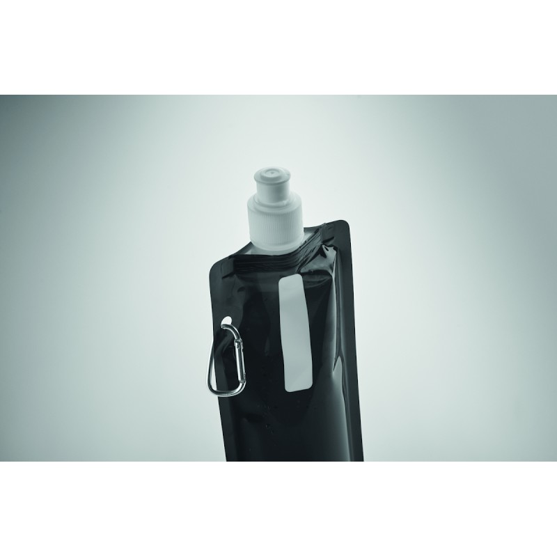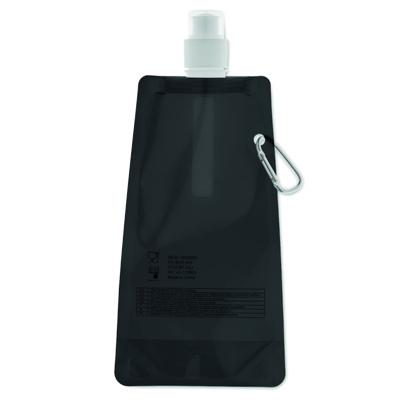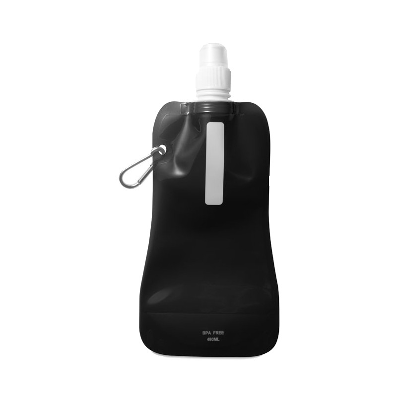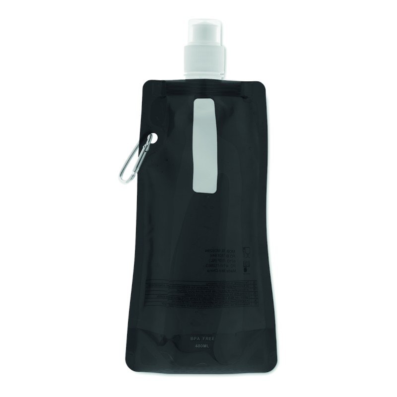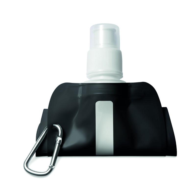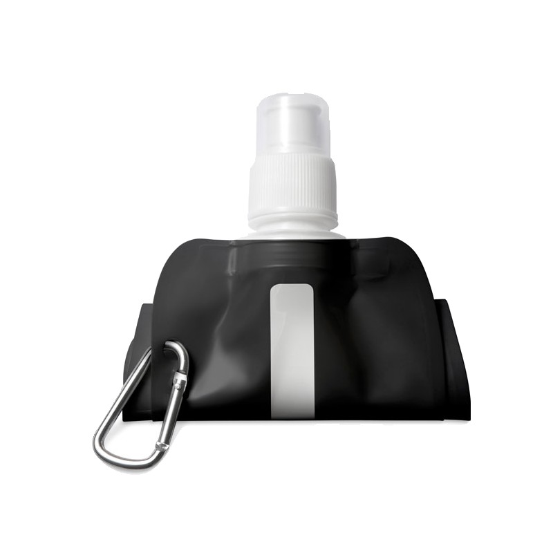 Gourde pliable en PET sans BPA, avec mousqueton en aluminium. Contenance 480 ml. Anti fuite.