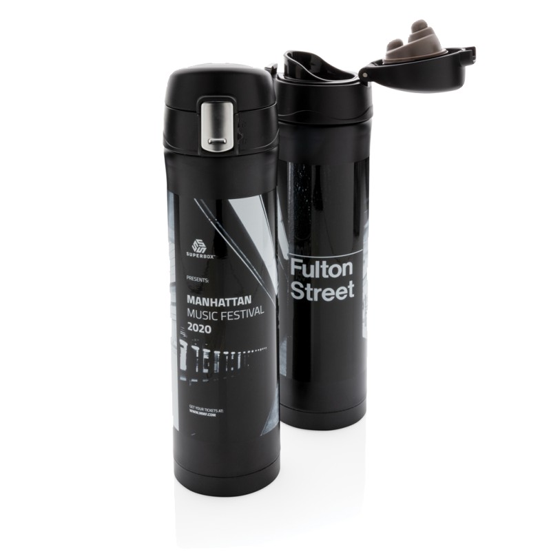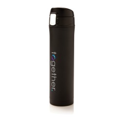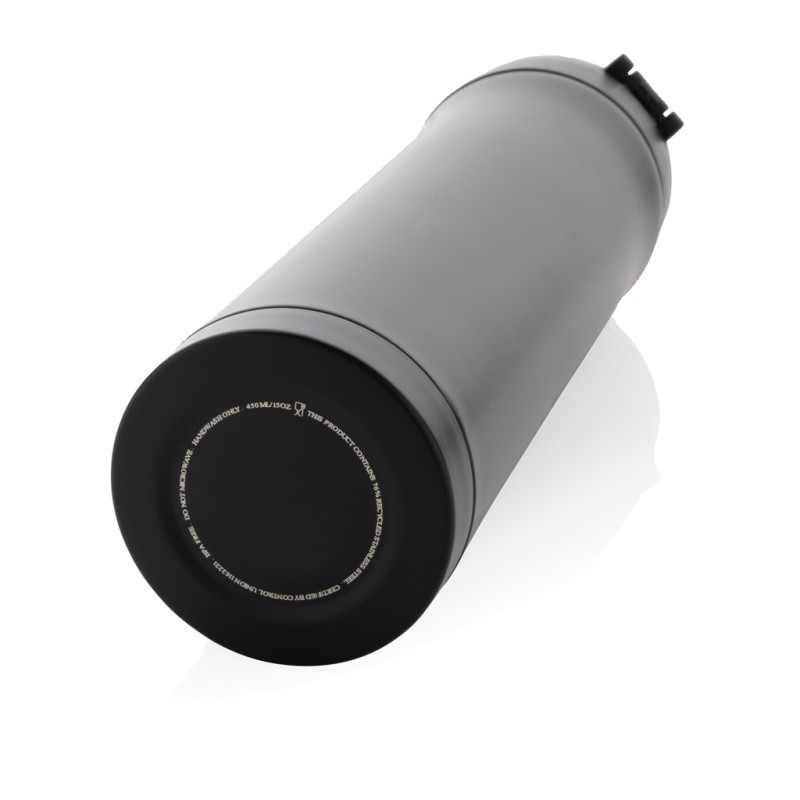Bouteille isotherme 450ml à double paroi en acier inoxydable permet de conserver votre boisson chaude jusqu'à 5 heures ou fraîche jusqu'à 15 heures. Le couvercle est verrouillable et évite ainsi tout risque de fuite ou de renversement. Le couvercle est facile à nettoyer pour une hygiène optimale et passe au lave-vaisselle. La taille de la gourde permet de la placer dans n'importe quel porte-bouteille de voiture. Fabriqué avec des matériaux recyclés certifiés RCS (Recycled Claim Standard). La certification RCS garantit une chaîne d'approvisionnement entièrement certifiée pour les matériaux recyclés. Contenu recyclé total : 76% sur la base du poids total de l'article. Sans BPA. Emballage kraft certifié FSC® inclus.