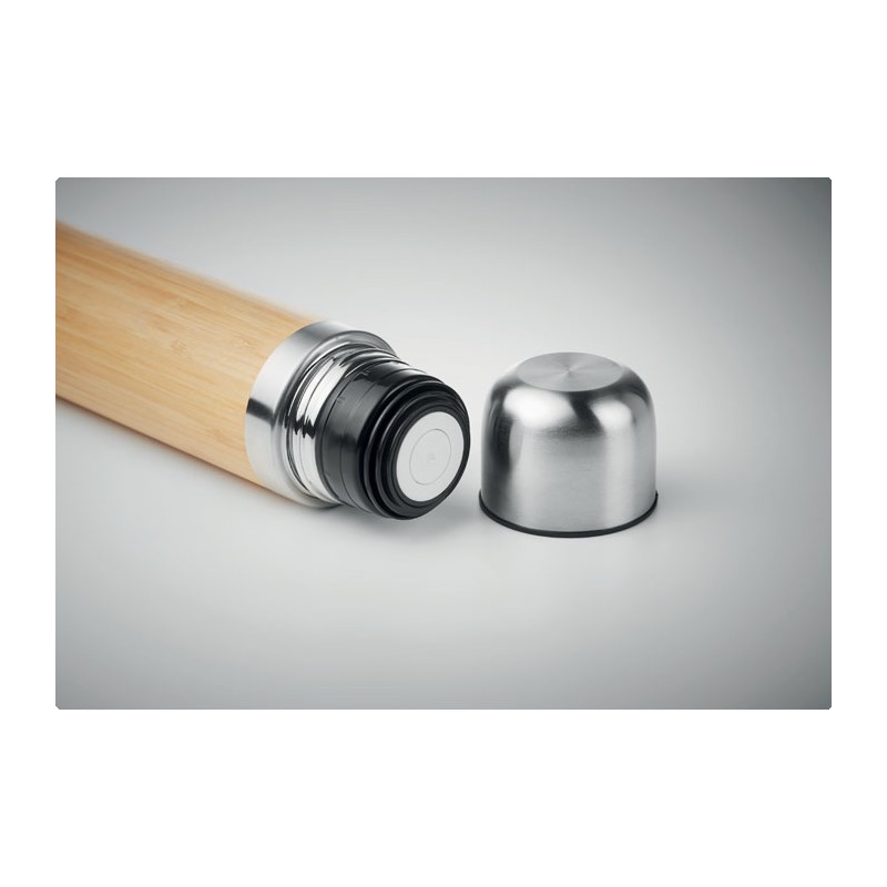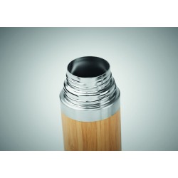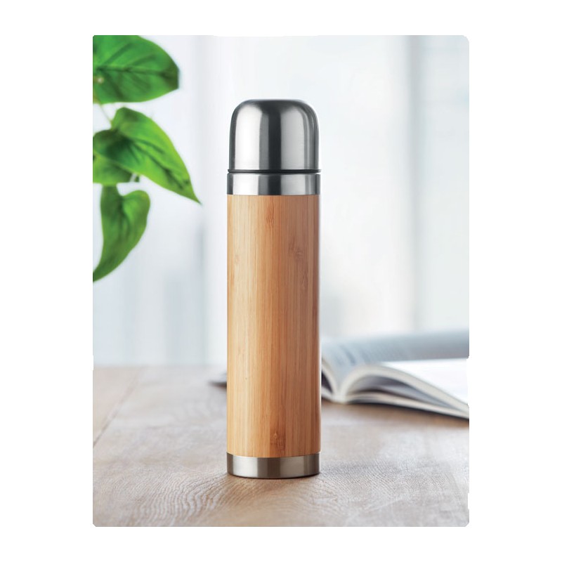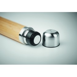 Gourde isotherme à double paroi en acier inoxydable et en bambou. Capacité 400 ml. Le bambou est un produit naturel, et présente de légères variations de couleur, de décoration et de tailles. Anti fuite.