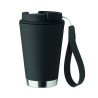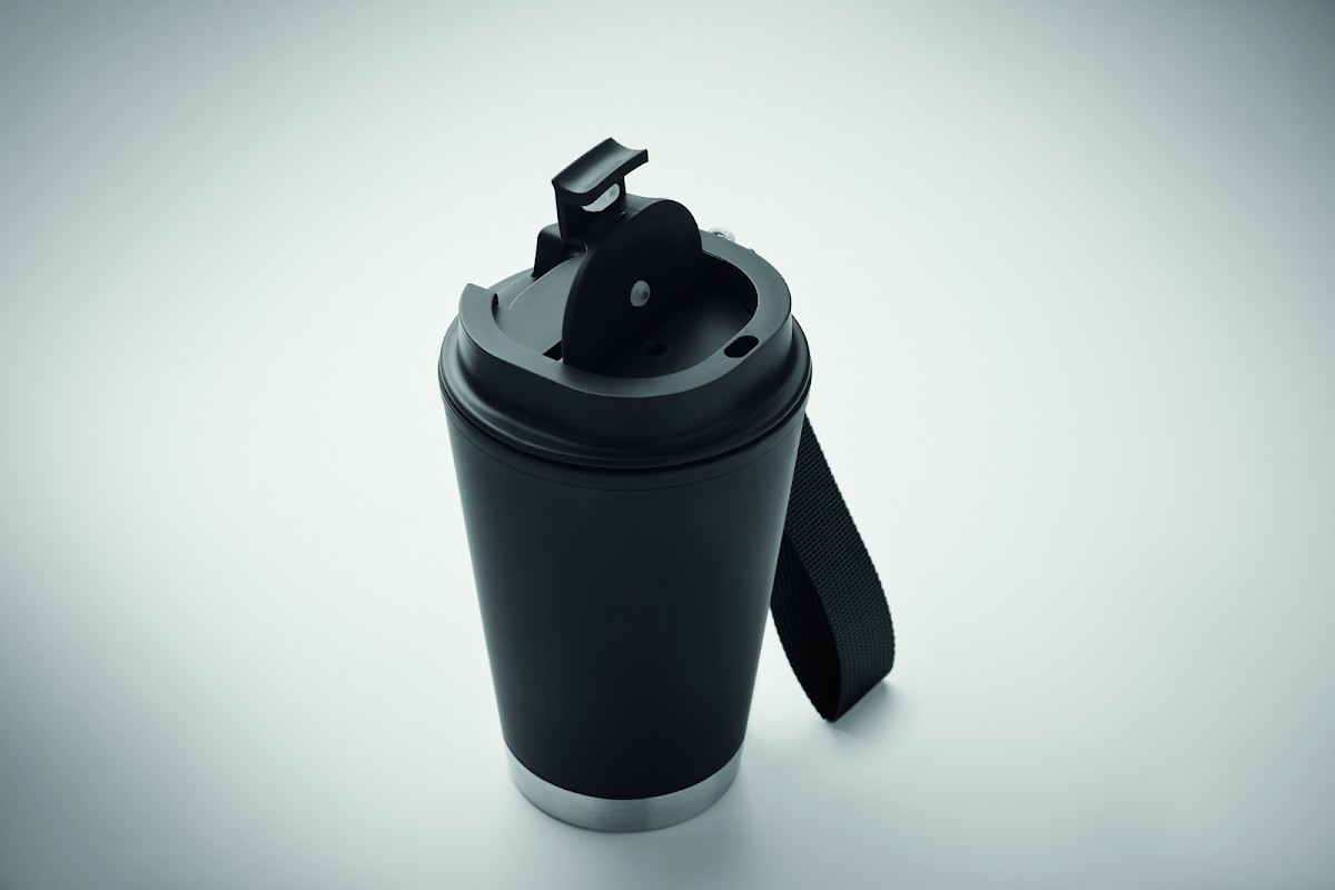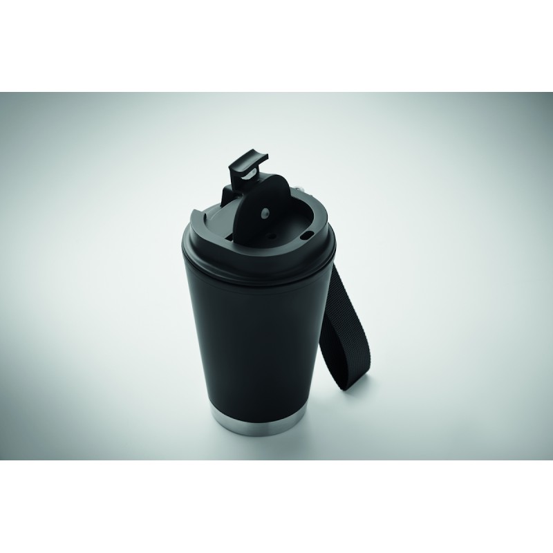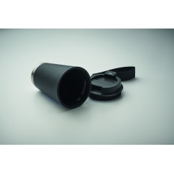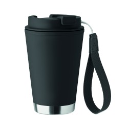 Gobelet à double paroi intérienr en PP, extérieur en PP recyclé, détails en acier inoxydable recyclé et bracelet en RPET. Capacité : 300 ml.