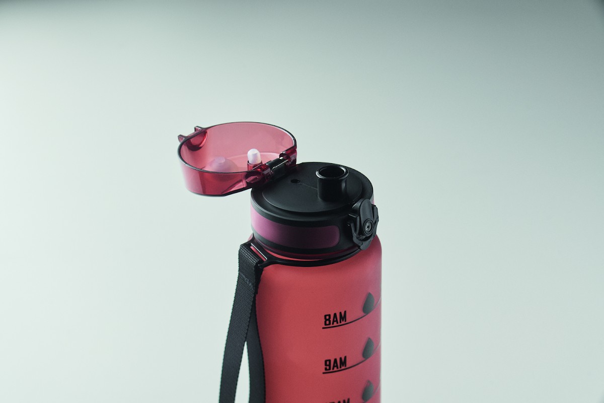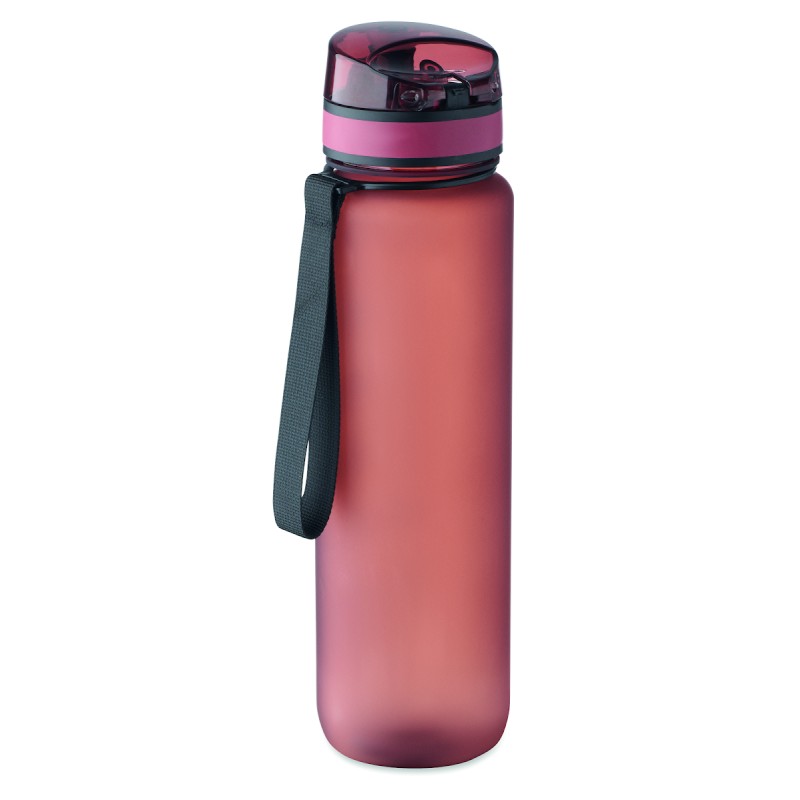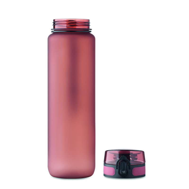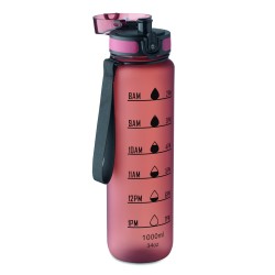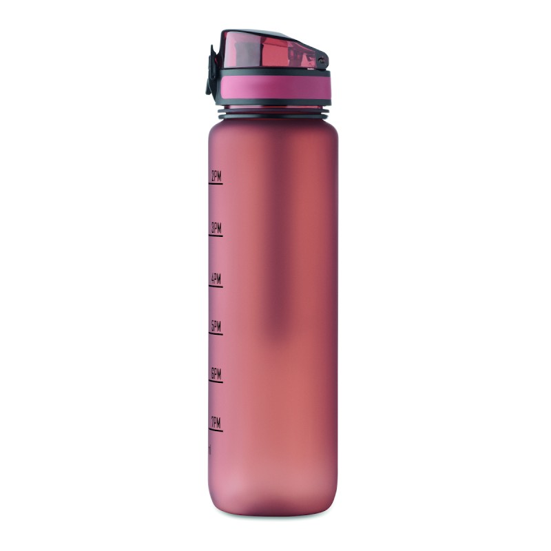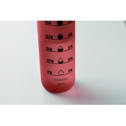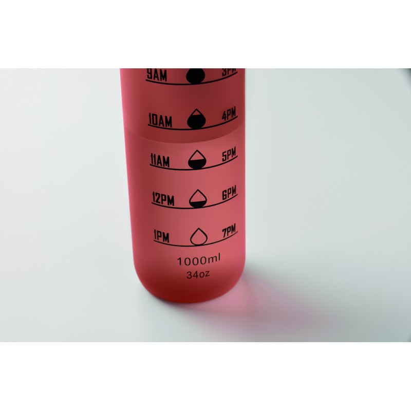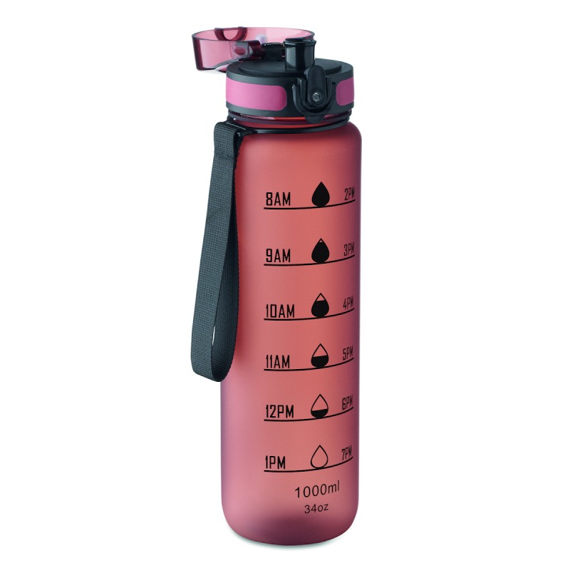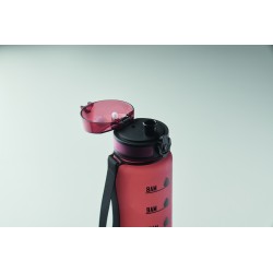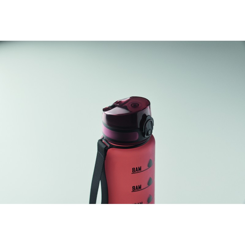 Bouteille de sport en RPET, marqueurs de temps motivants, couvercle à ouverture d'une seule main, fermeture de sécurité et sangle de transport. Anti fuite. Capacité : 1 litre.