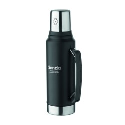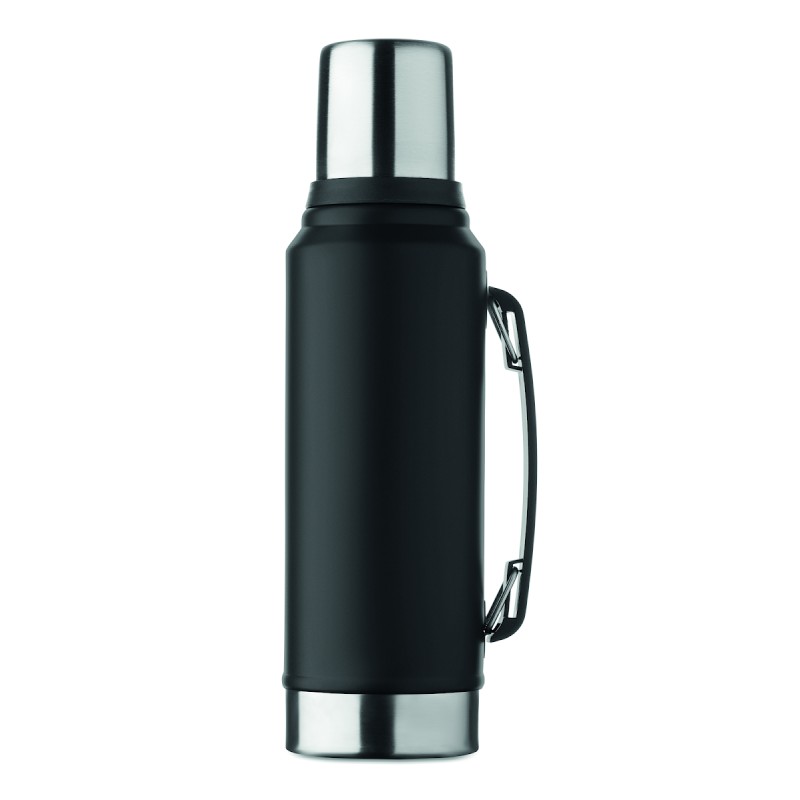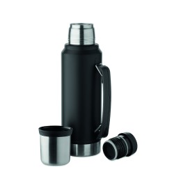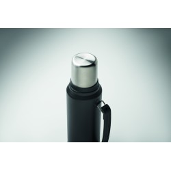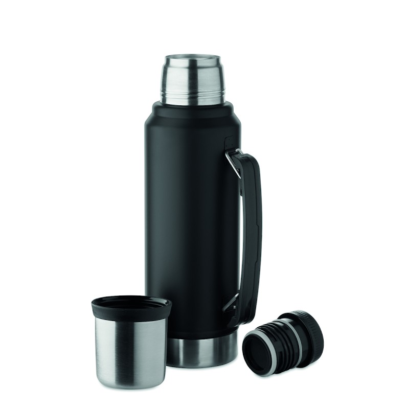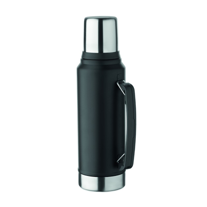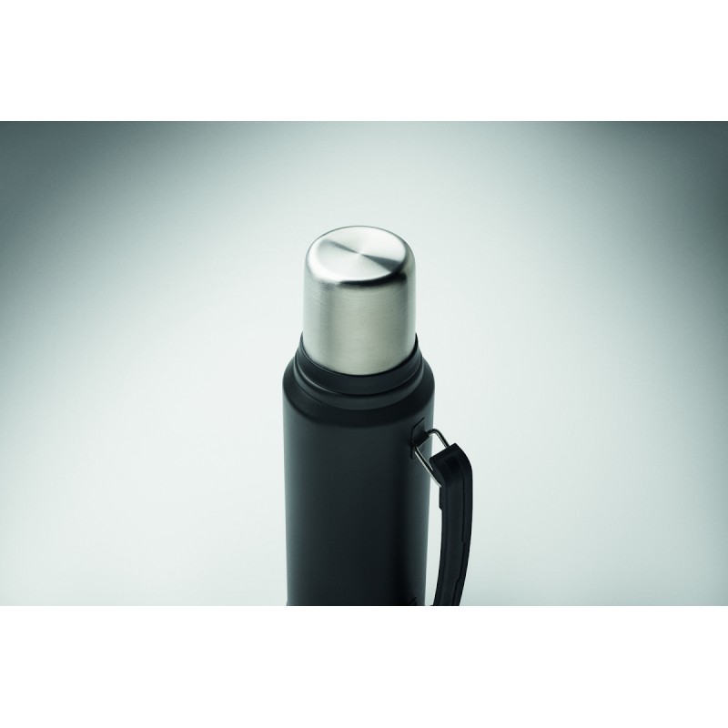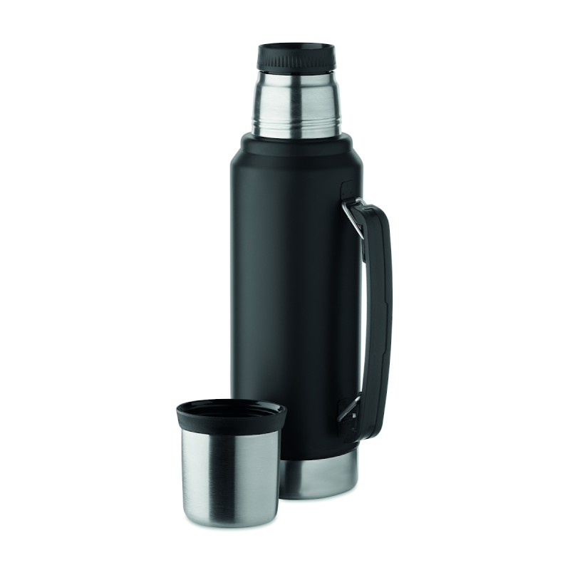 Bouteille double paroi à vide isolant en acier inoxydable recyclé (90 % d'acier inoxydable recyclé et 10 % d'acier inoxydable) avec poignée sur le côté. Couvercle en PP et gobelet en acier inoxydable recyclé. Anti fuite. Capacité : 1L.