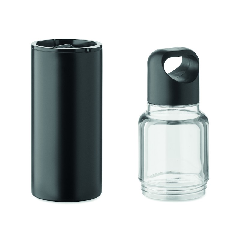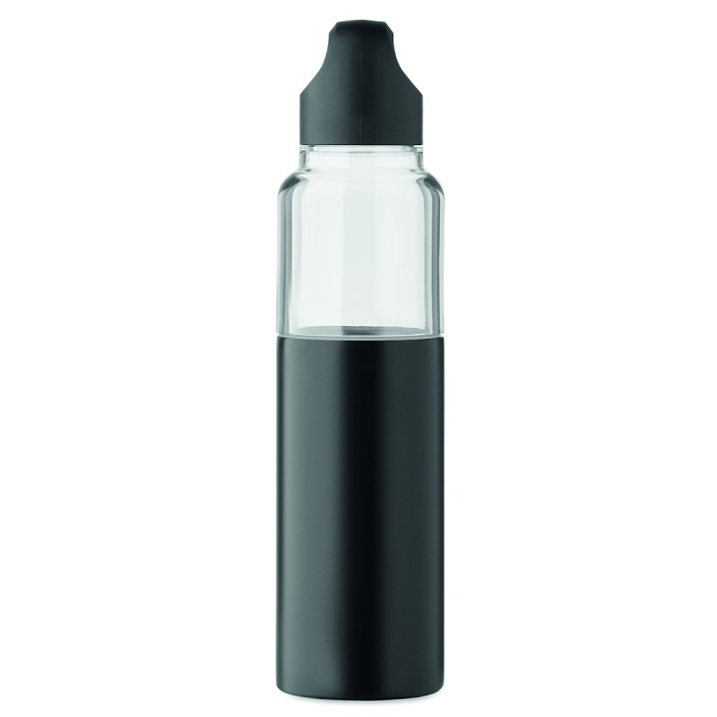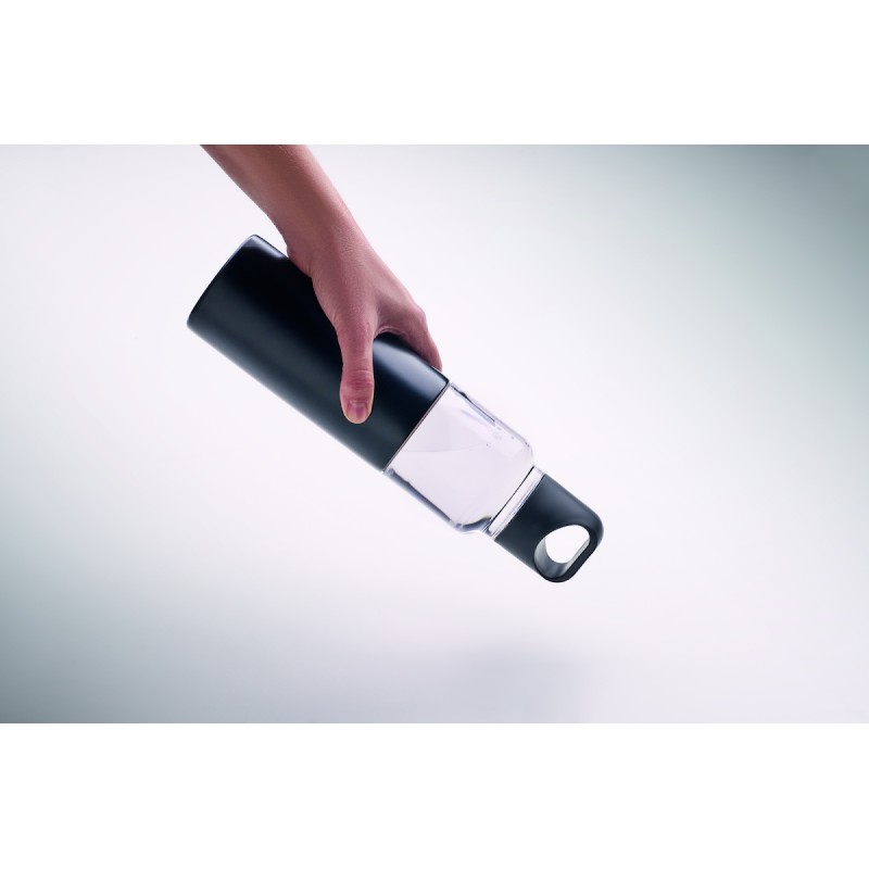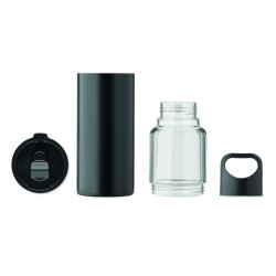 Bouteille rechargeable 2 en 1 en Tritan et gobelet double paroi en acier inoxydable recyclé (90 % recyclé et 10 % acier inoxydable). 2 couvercles en PP. Capacité totale 610 ml, le gobelet seul 350 ml.