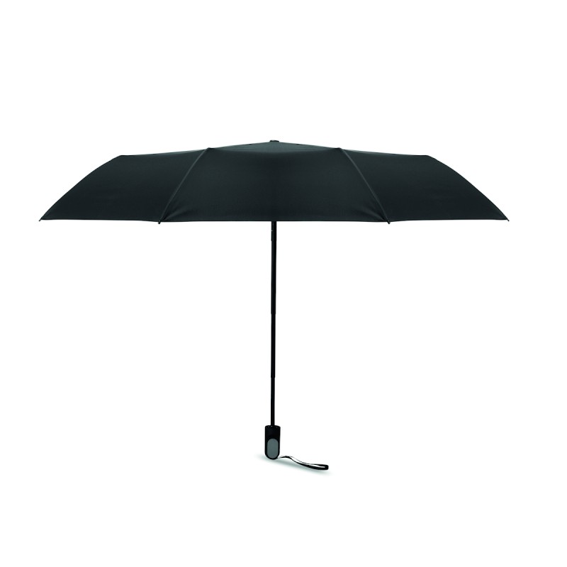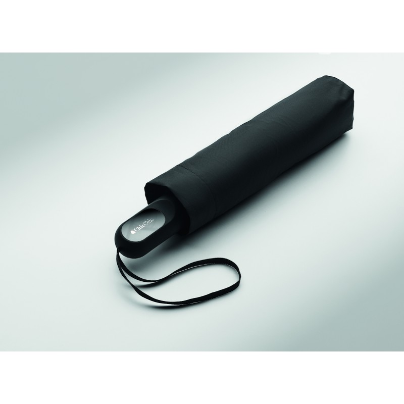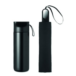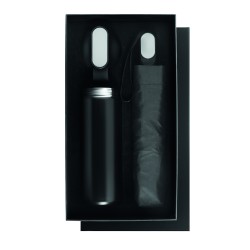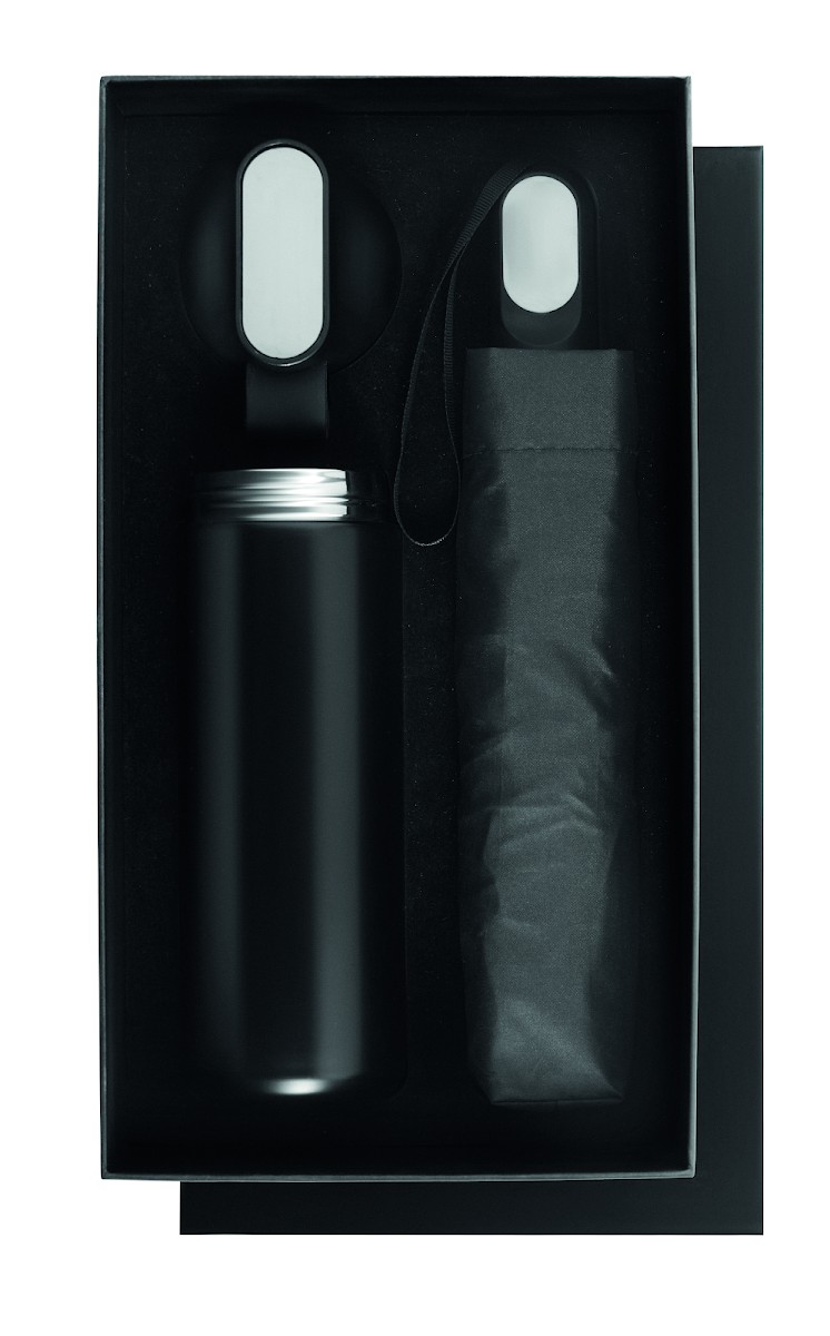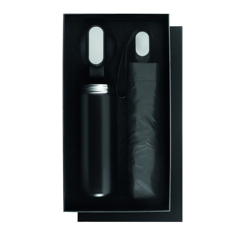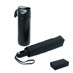Coffret cadeau 2 pièces: 1 bouteille en acier inox recyclé (90%) double paroi 600 ml couvercle PP, détails en métal et poignée en silicone, 1 parapluie pliable de 21'' en pongé avec poignée en ABS.