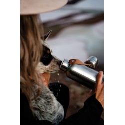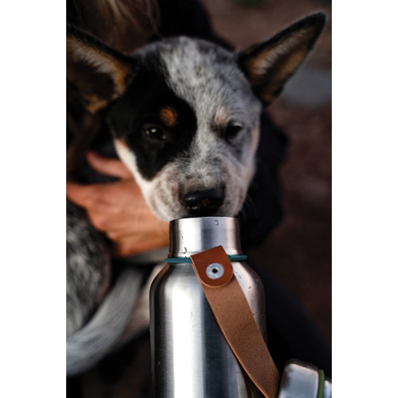 Bouteille d'eau isotherme en acier inoxydable, élégante bouteille sous vide qui garde les boissons froides pendant 24 heures ou chaudes pendant 12 heures. Le couvercle est également en acier inoxydable, ce qui signifie que l'eau n'entre pas en contact avec du plastique. Le cuir artificiel sert de dragonne de transport et constitue un joli détail esthétique. Lavage à la main uniquement.