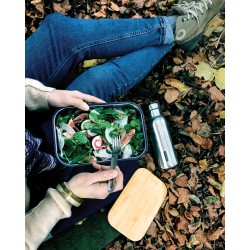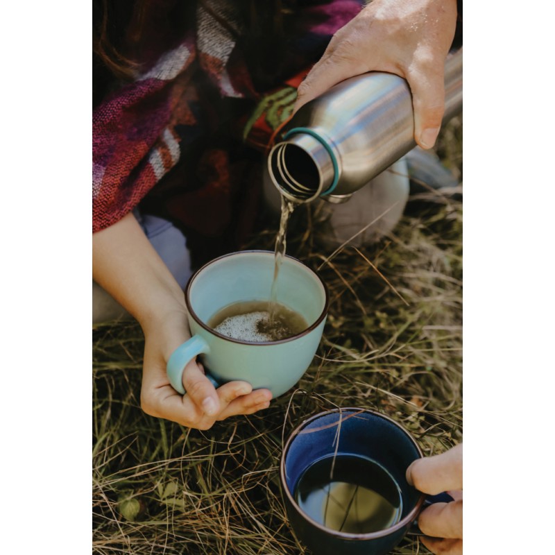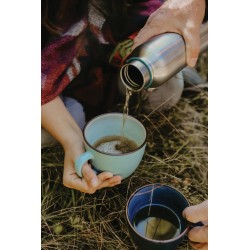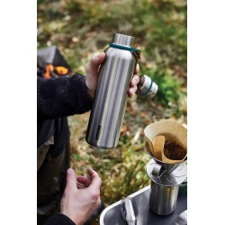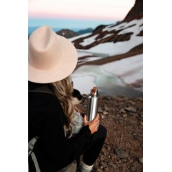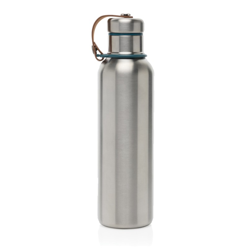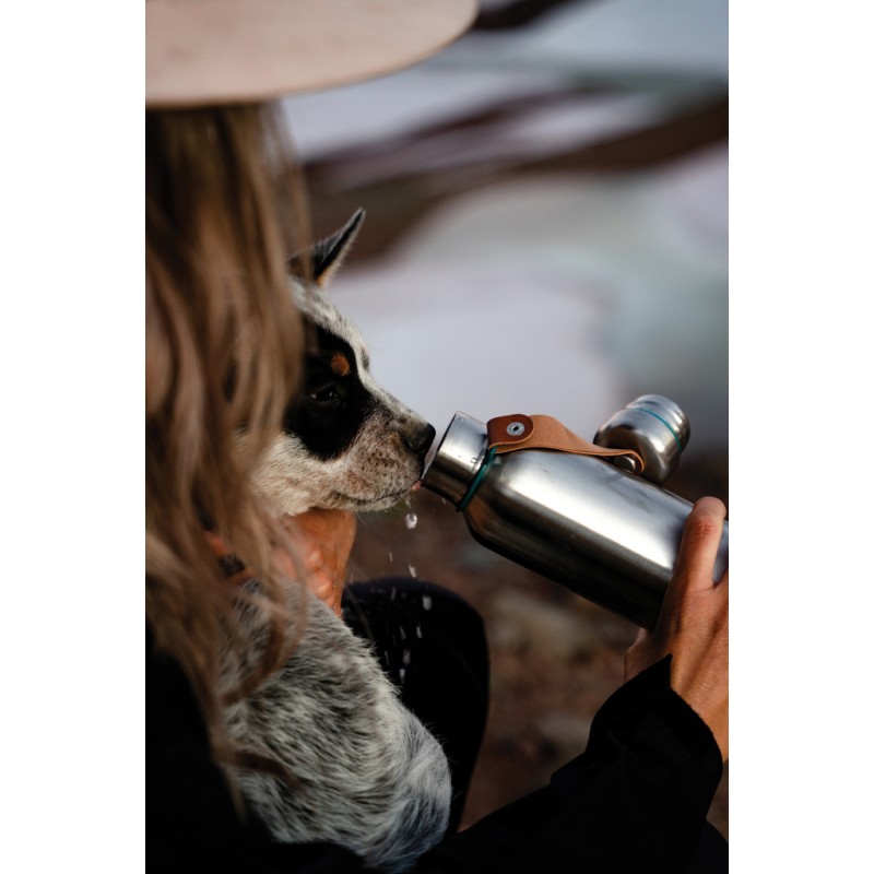 Bouteille d'eau isotherme en acier inoxydable, élégante bouteille sous vide qui garde les boissons froides pendant 24 heures ou chaudes pendant 12 heures. Le couvercle est également en acier inoxydable, ce qui signifie que l'eau n'entre pas en contact avec du plastique. Le cuir artificiel sert de dragonne de transport et constitue un joli détail esthétique. Lavage à la main uniquement.