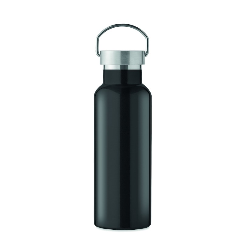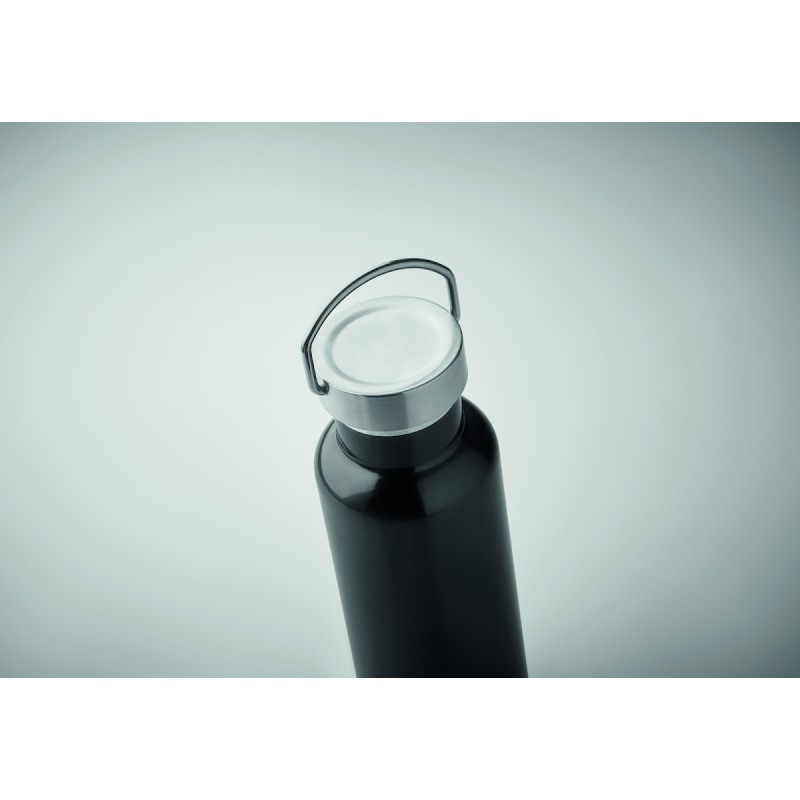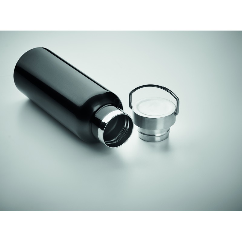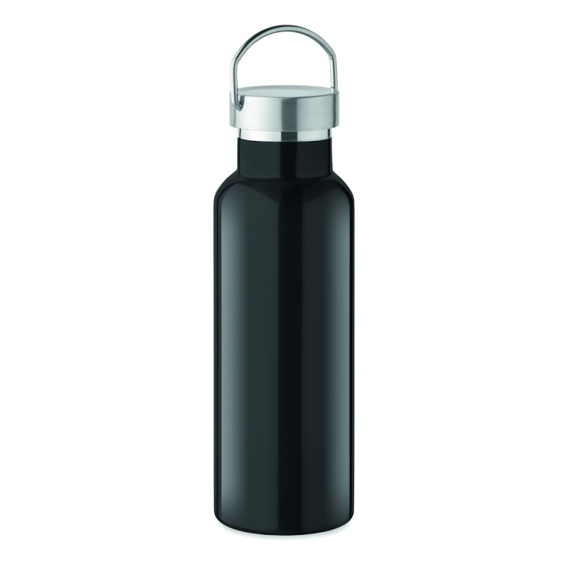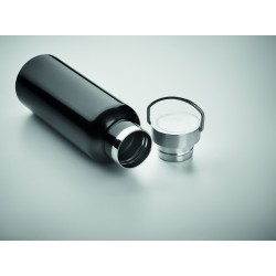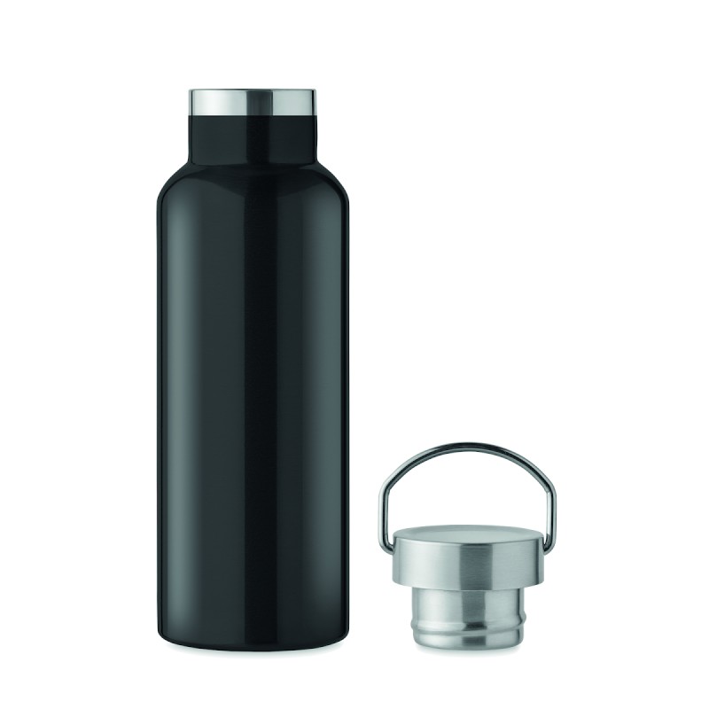 Bouteille à vide isolant à double paroi en acier inoxydable recyclé (90 % d'acier inoxydable recyclé et 10 % d'acier inoxydable) avec couvercle et poignée. Anti fuite. Capacité : 500 ml.