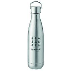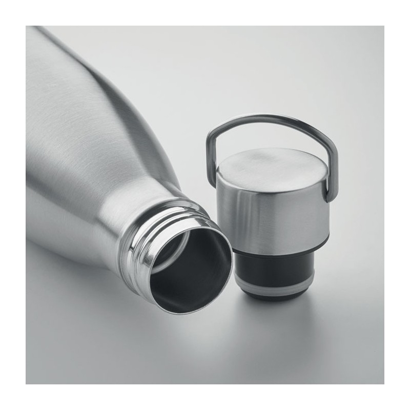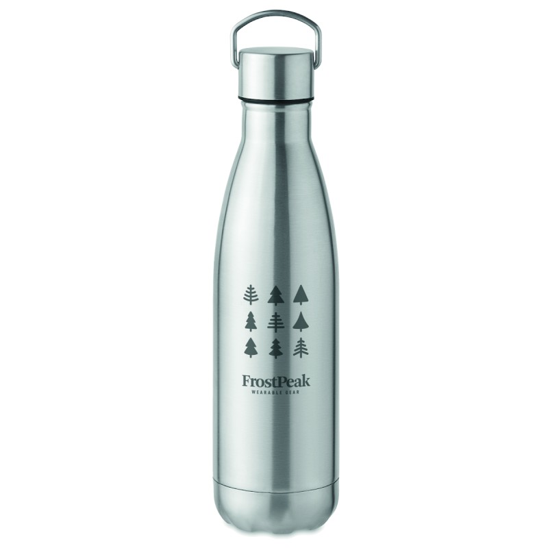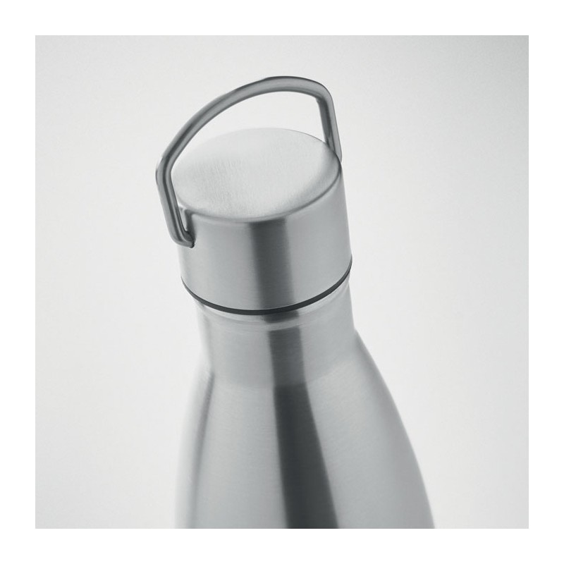 Bouteille à double paroi en acier inoxydable recyclé (90 % d'acier inoxydable recyclé et 10 % d'acier inoxydable) avec couvercle à poignée. Anti fuite. Capacité : 500 ml.