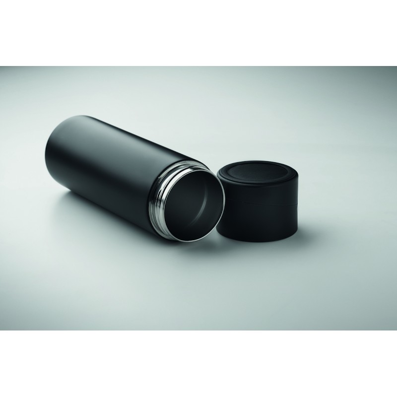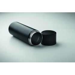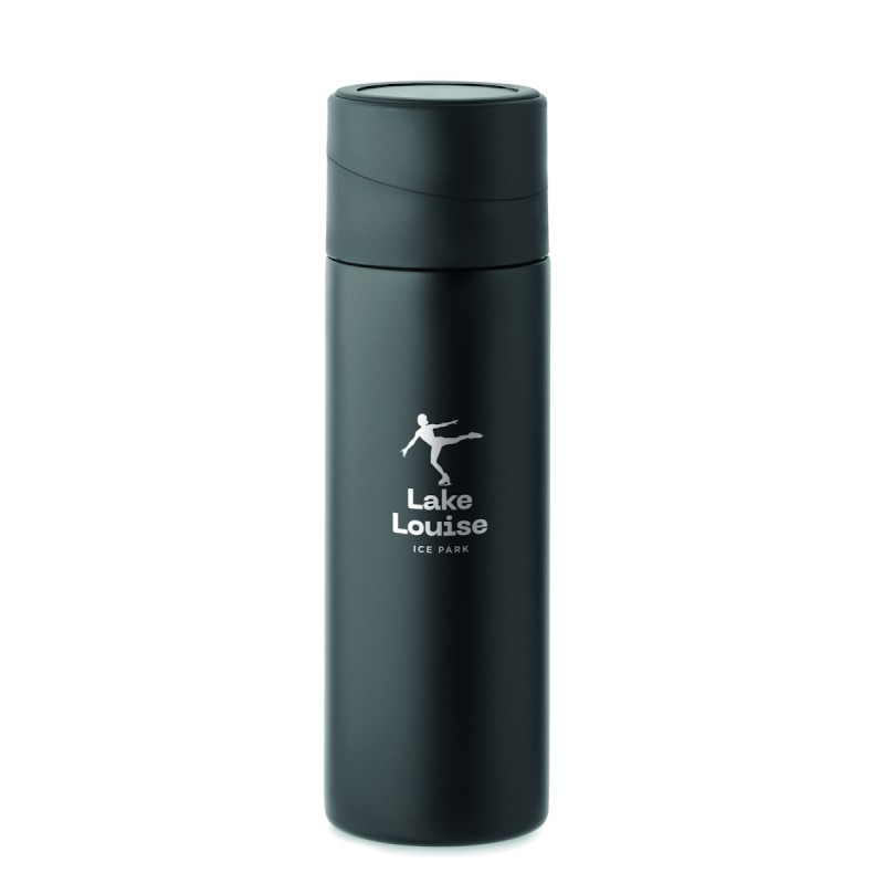 Bouteille isolante sous vide à double paroi en acier inoxydable recyclé (90 % d'acier inoxydable recyclé et 10 % d'acier inoxydable) avec couvercle en silicone antidérapant pour téléphone portable. Anti fuite. Capacité : 420 ml.