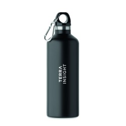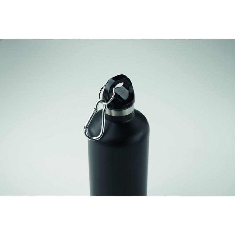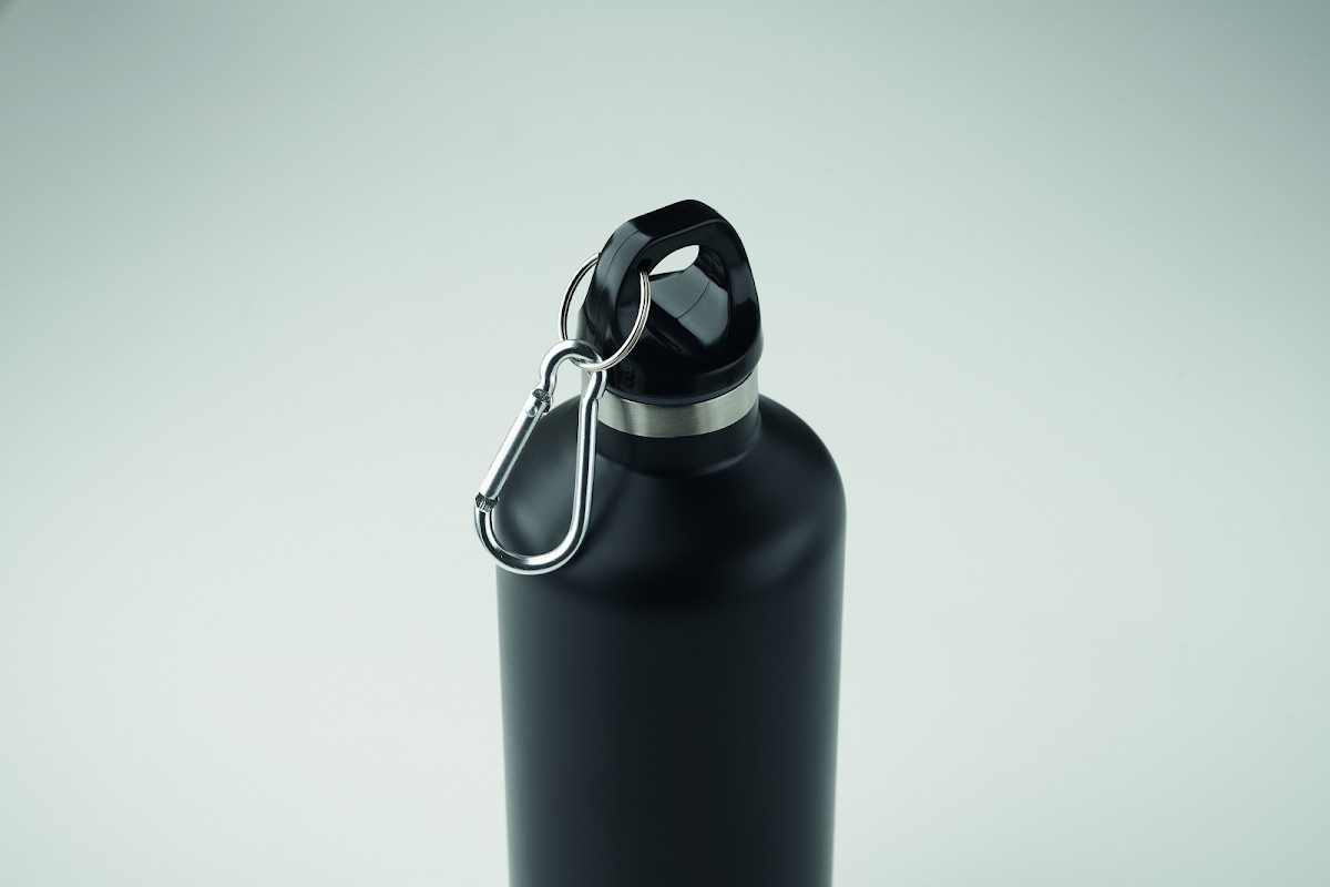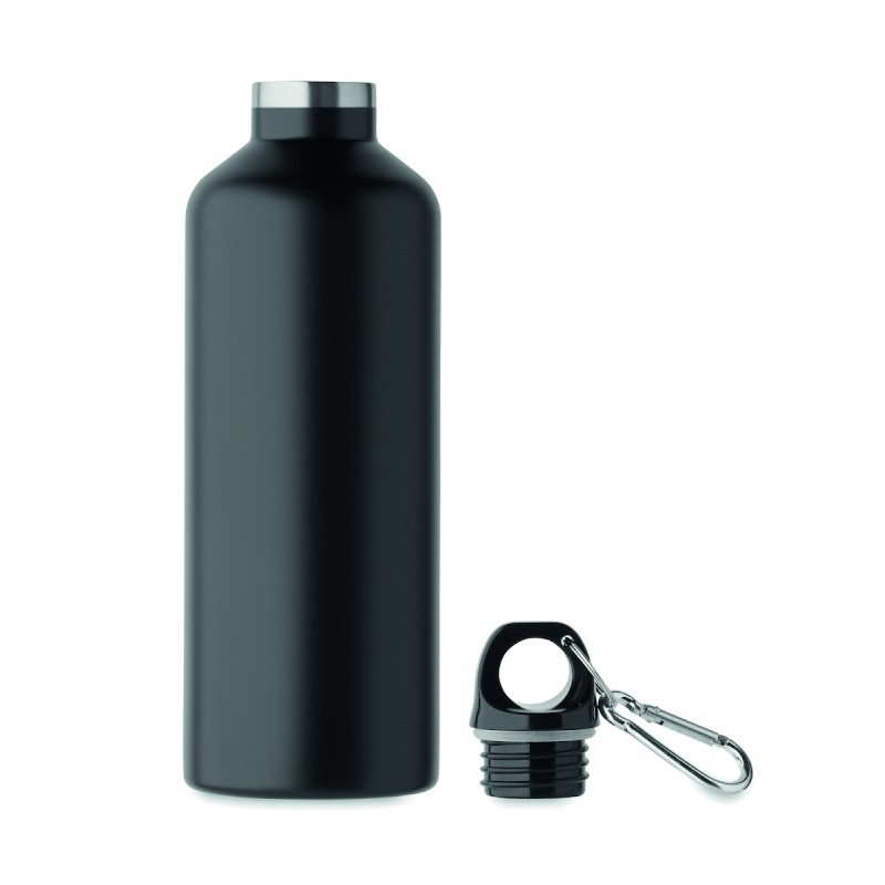 Bouteille isolante sous vide à double paroi en acier inoxydable recyclé (90 % d'acier inoxrecyclé et 10 % d'acier inox) avec couvercle à poignée mousqueton. Le mousqueton n'est pas destiné à l'escalade (usage non professionnel). Anti fuite. Capacité : 500 ml.