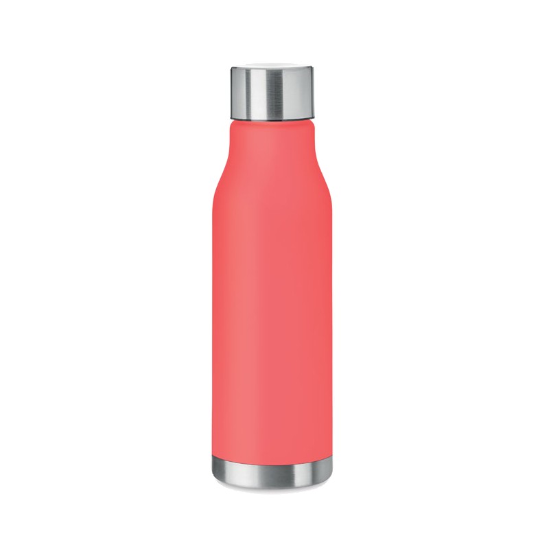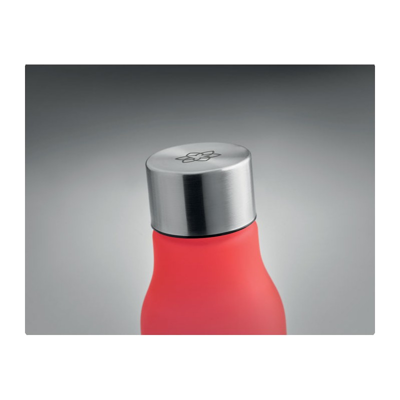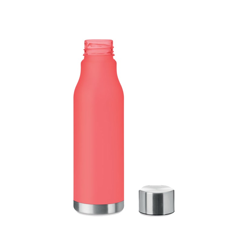 Bouteille en RPET avec finition caoutchoutée et acier inoxydable. Bouchon intérieur en RPET et anneau en silicone. Sans BPA. Anti fuite. Contenance : 600 ml. Ne convient pas aux boissons gazeusesAnti fuite.