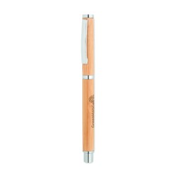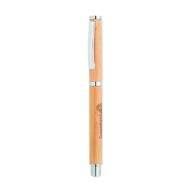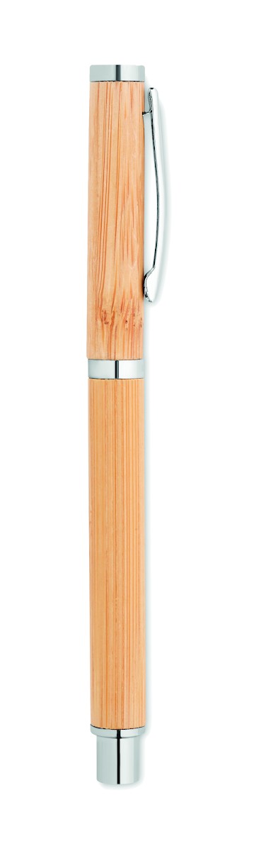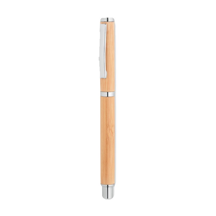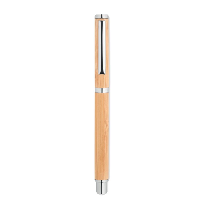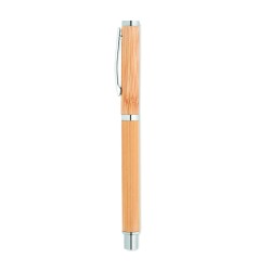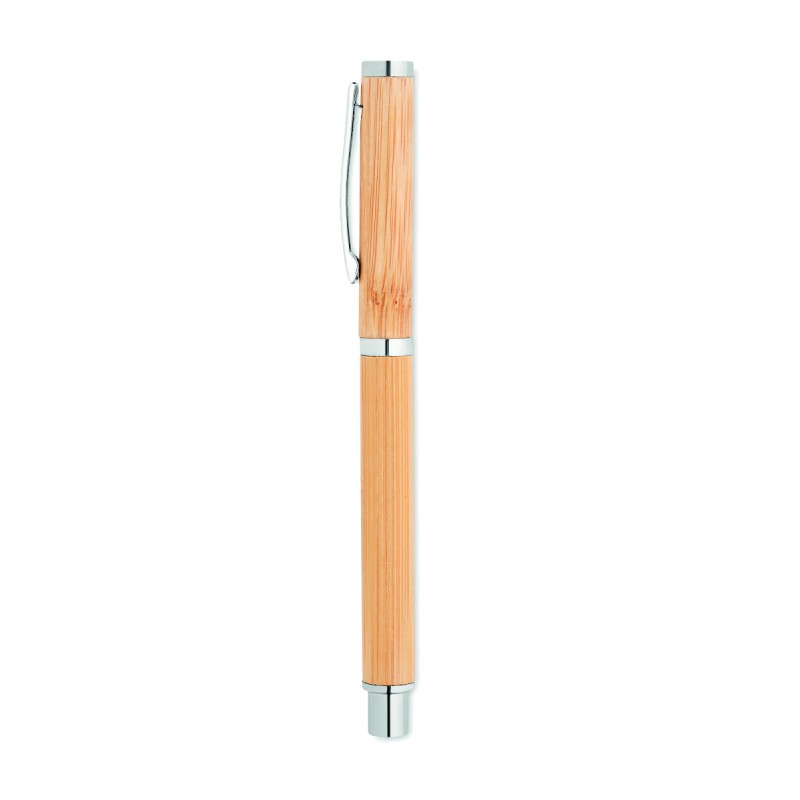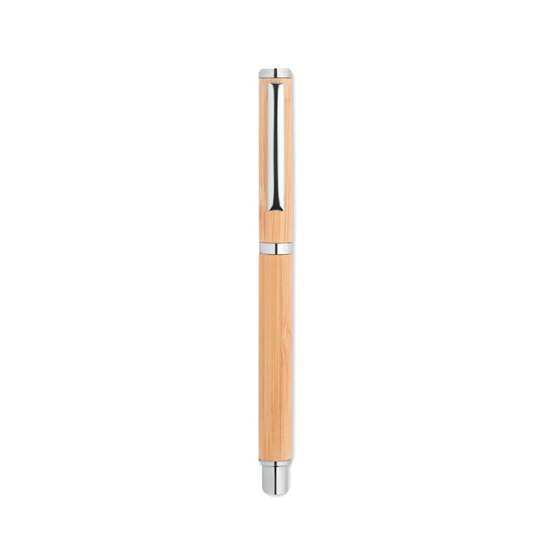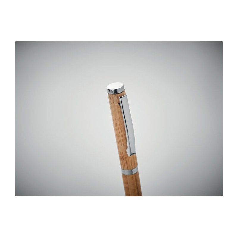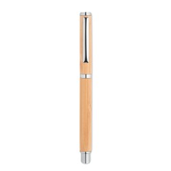 Stylo à bille à corps en bambou avec attributs en acier inoxydable. Encre gel bleue. Le bambou est un produit naturel, et présente de légères variations de couleur, de décoration et de tailles.