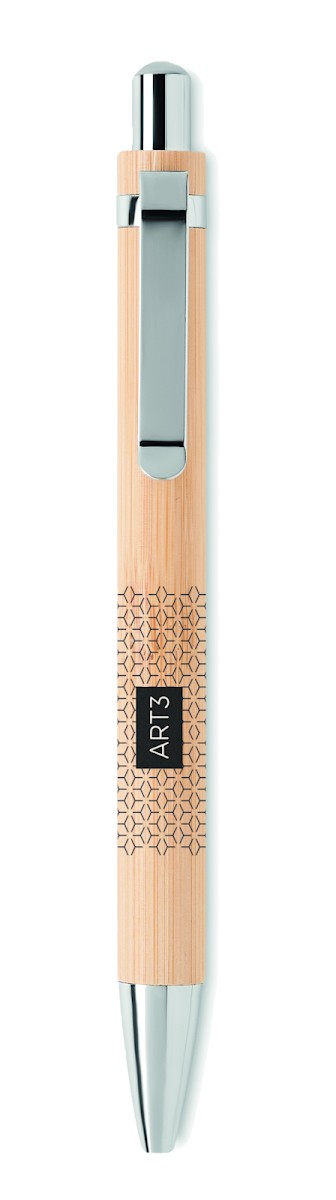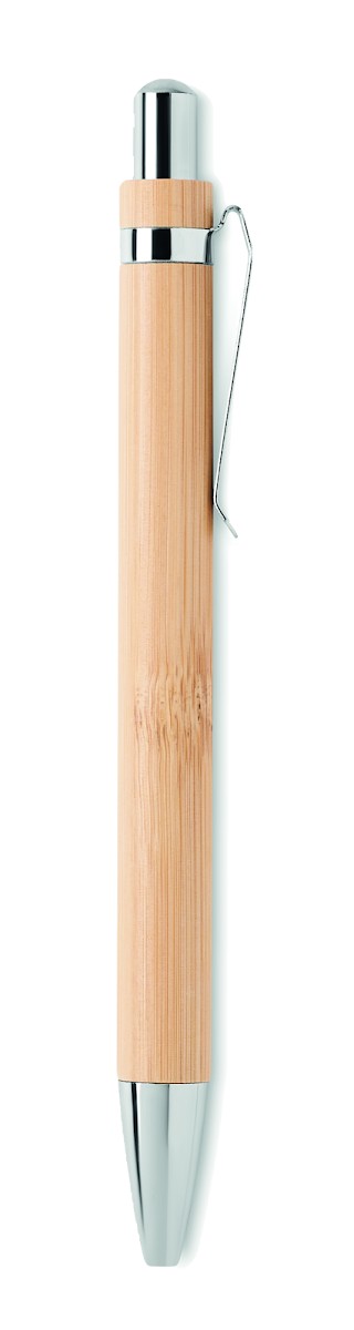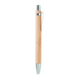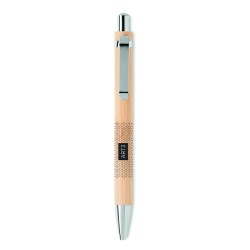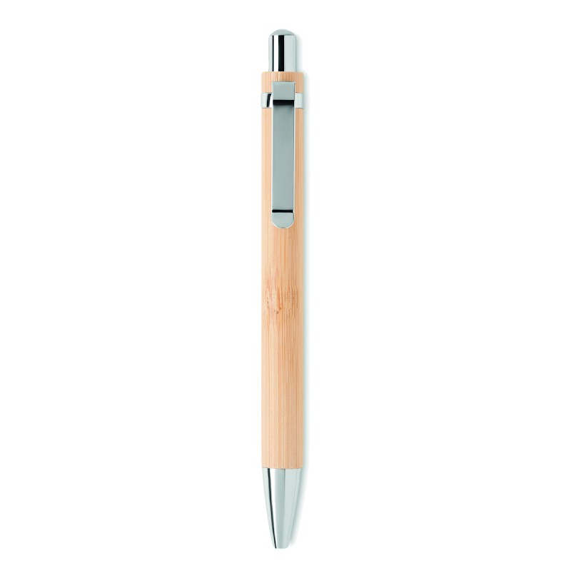 Stylo sans encre à bouton-poussoir de longue durée avec corps en bambou et accessoires chromés brillants. Le stylo écrit avec la pointe en graphite. Le bambou étant un produit naturel, il peut y avoir de légères variations de couleur et de taille d'un article à l'autre, ce qui peut affecter le résultat final de la décoration.