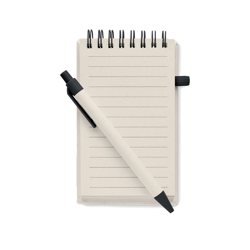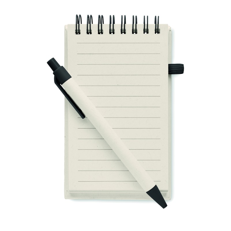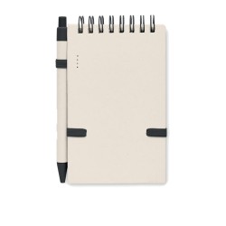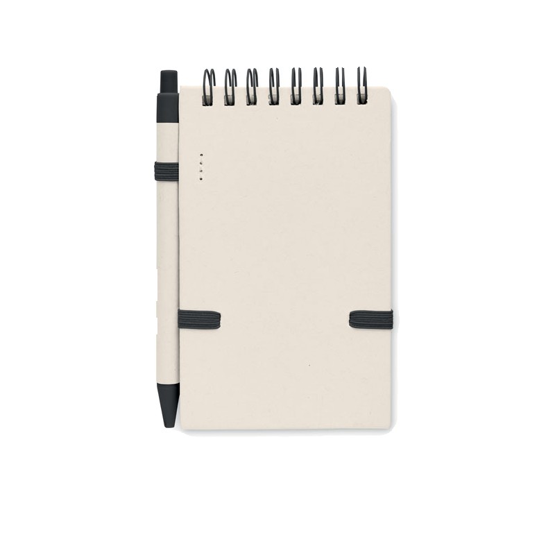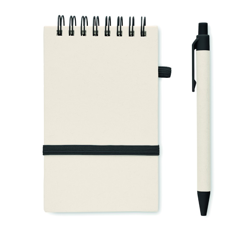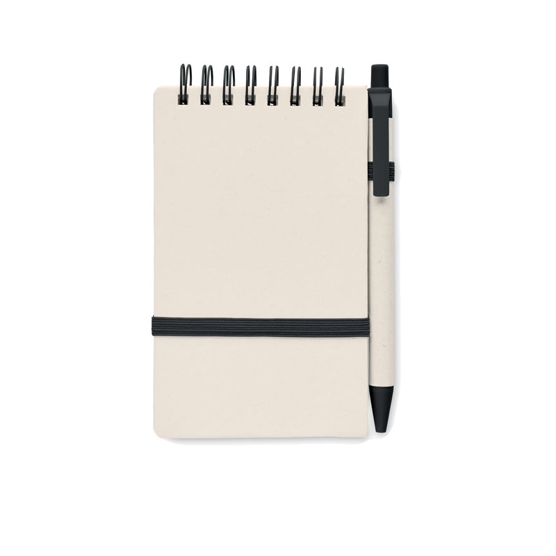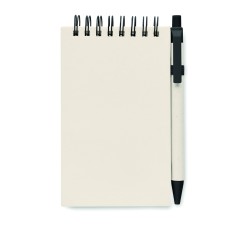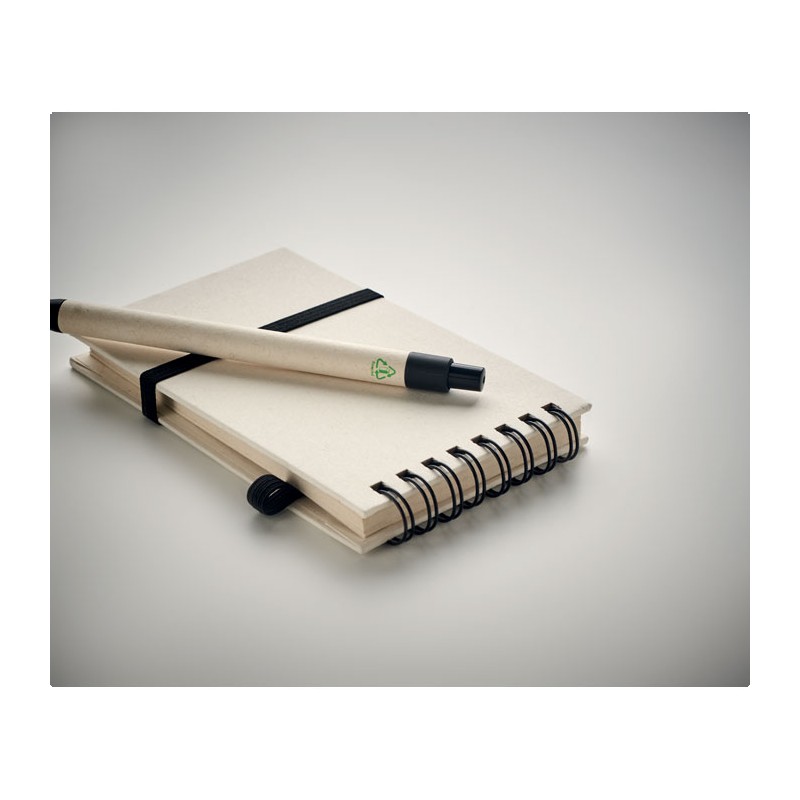 Carnet A6 en carton de lait recyclé 70 feuilles de papier recyclé (70 % carton, 30 % papier recyclé) et stylo assorti. Reliure spirale. Stylo bille à bouton-poussoir assorti. Encre bleue. Bande élastique et porte-stylo.