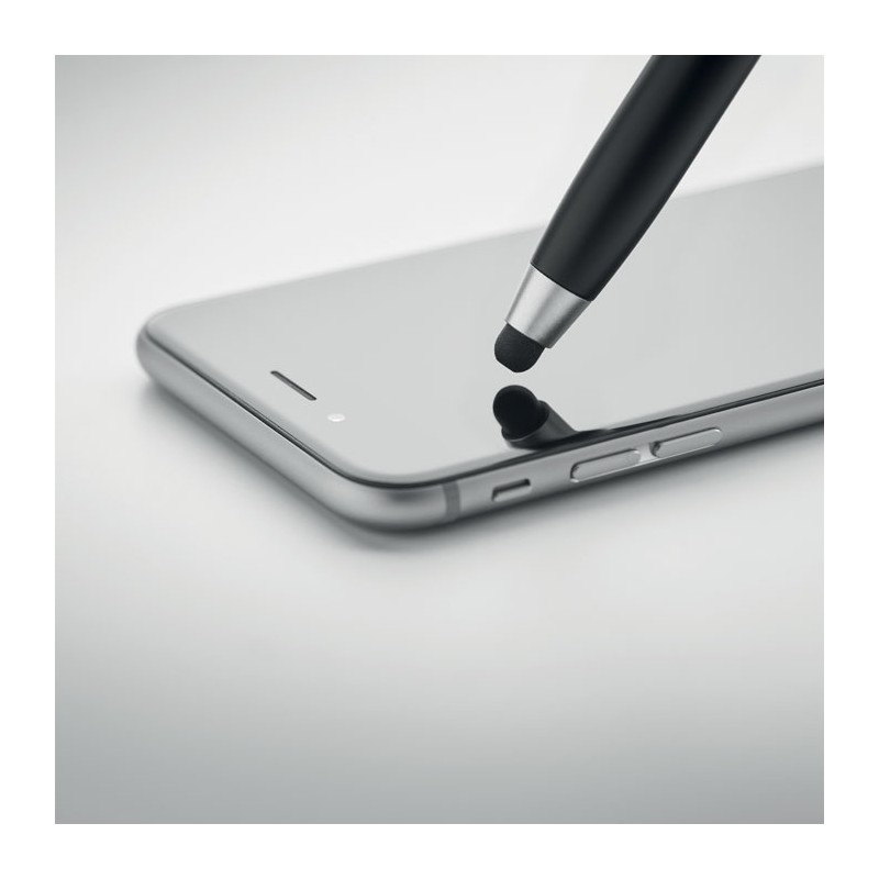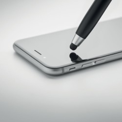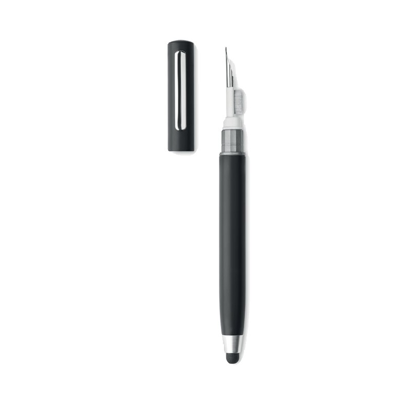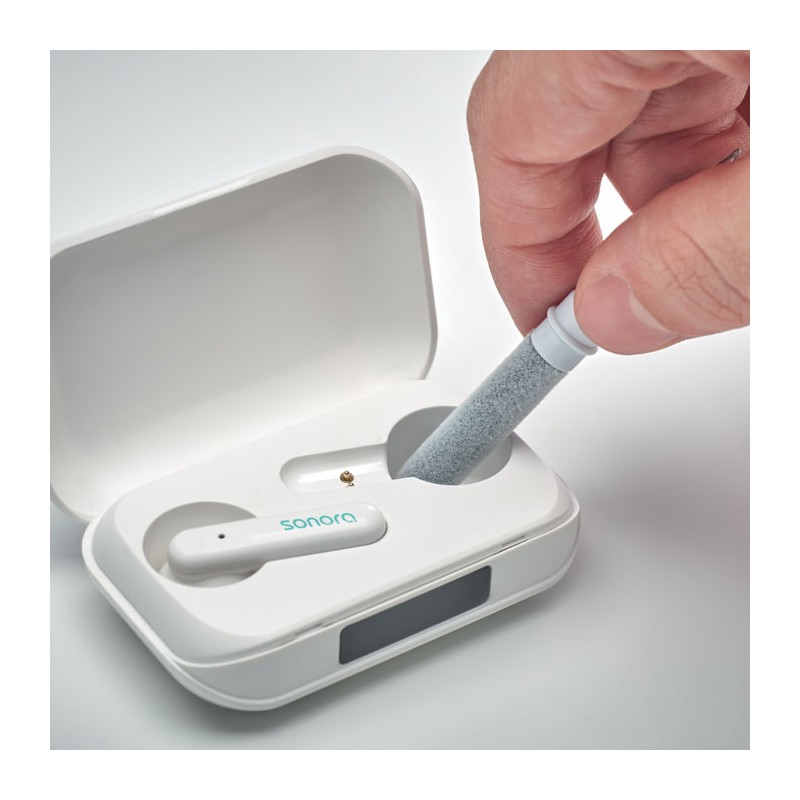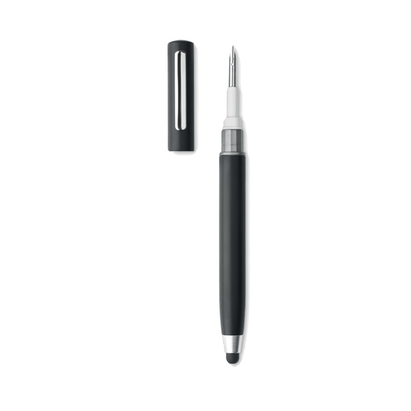 Stylo à bille twist avec stylet en ABS. Comprend également un Kit de nettoyage pour oreillettes sans fil : pince métallique, éponge et brosse. Encre bleue.