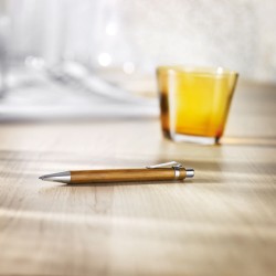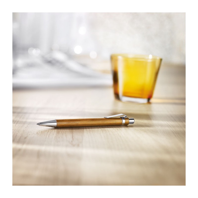 Stylo bille automatique Bambou avec accessoire chromé. Encre bleue. Le bambou est un produit naturel, et présente de légères variations de couleur, de décoration et de tailles.