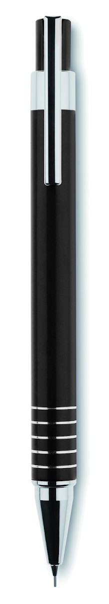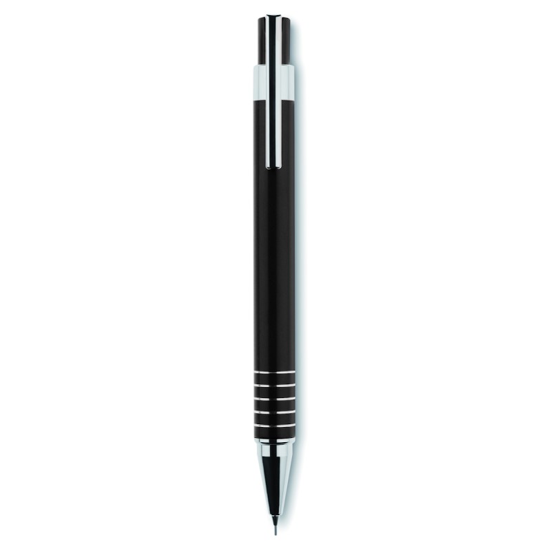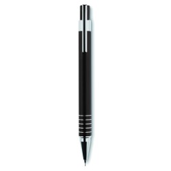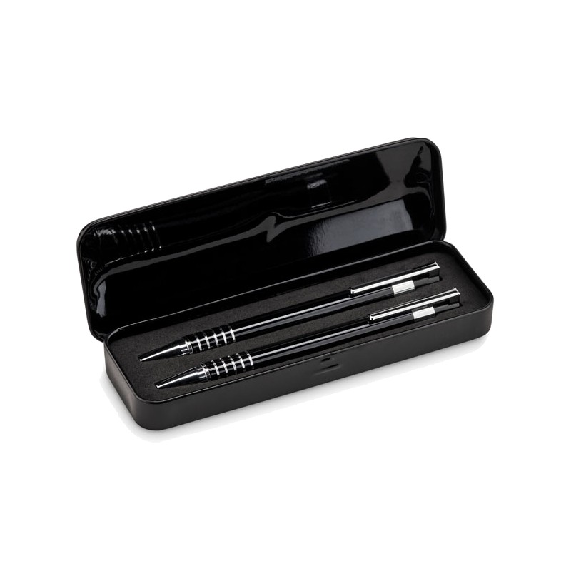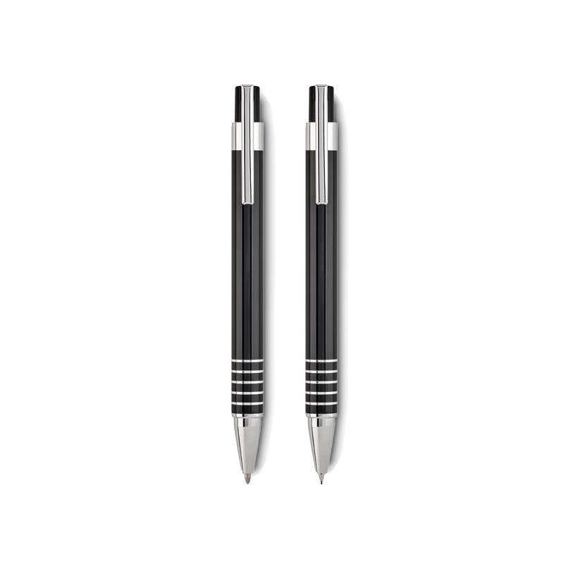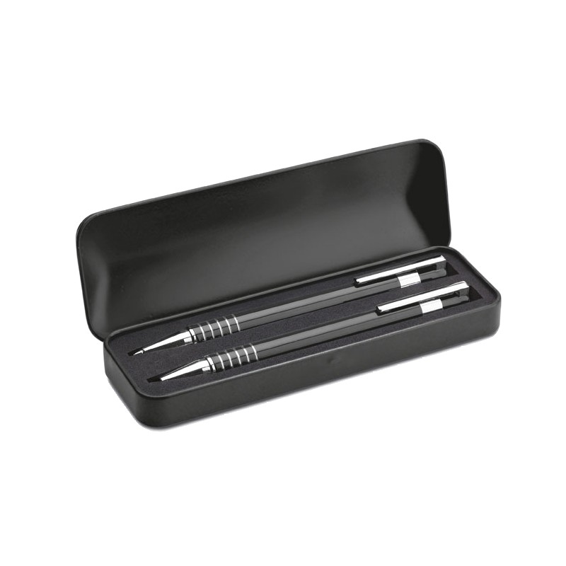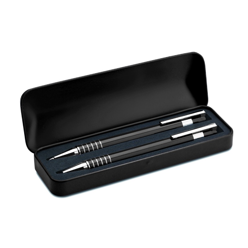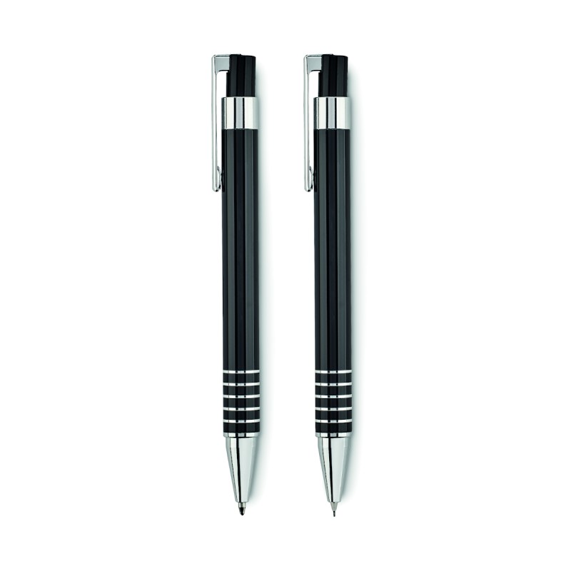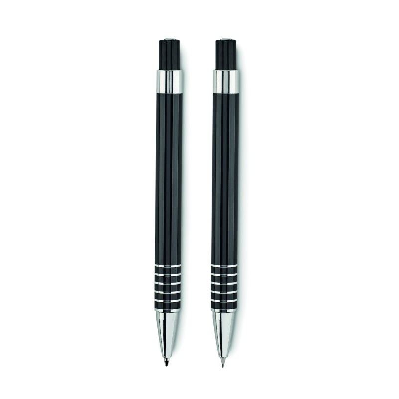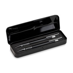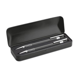 Set stylo en aluminium comprenant un stylo bille poussoir à encre bleue et un portemine dans un coffret métal.